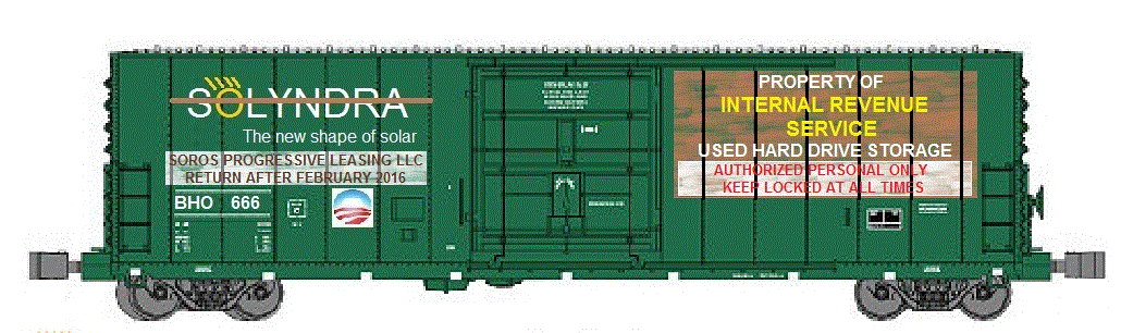 The train will also need a Pay Car, run by the IRS. Although in real life it was meant to pay OUT to employees, for the Obama Special, it will be a pay IN, you keep paying taxes, and someday you die and don't have to anymore. I have some old passenger cars, I bet I can find a black one to use for this.
