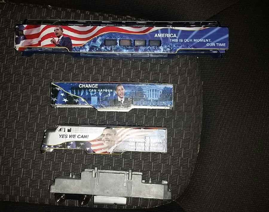 Bicentennial engine would be good, I have plenty of those to work with. I also have plenty of F7 chassis's around here, too, I'm sure I can find something to use under this shell, power or dummy. Same with the B unit. I will probably have to scavenge a Bachmann 85 foot passenger for the base for the Obama dome. I'll leave the glass broken in it, though. I am shocked how this train withstood young children, being banged around in the toy bin, no telling how long it's been in there, maybe not long. None of the actual plastic other than the dome glass is broken, all 3 pieces I got are intact. Amazing. Who knows on the future value, I intend to get maximum play value out of it NOW I am not going to try to restore it, not why I bought it. I'm sure there will be other sets out there in pristine condition to satisfy the collectors, this one is getting used. Other ideas are to get a Republic(an) Steel engine, or maybe a Michelle "Bachmann" engine, to pull the decrepit hulk around. I might need a split dining car, one side for the masses with school lunch menu items, the other for the elites with steak and lobster. Throw some more ideas at me, as well. I welcome satirical suggestions. Will start looking for the chassis parts soon to at least get it rolling, or limping, along.