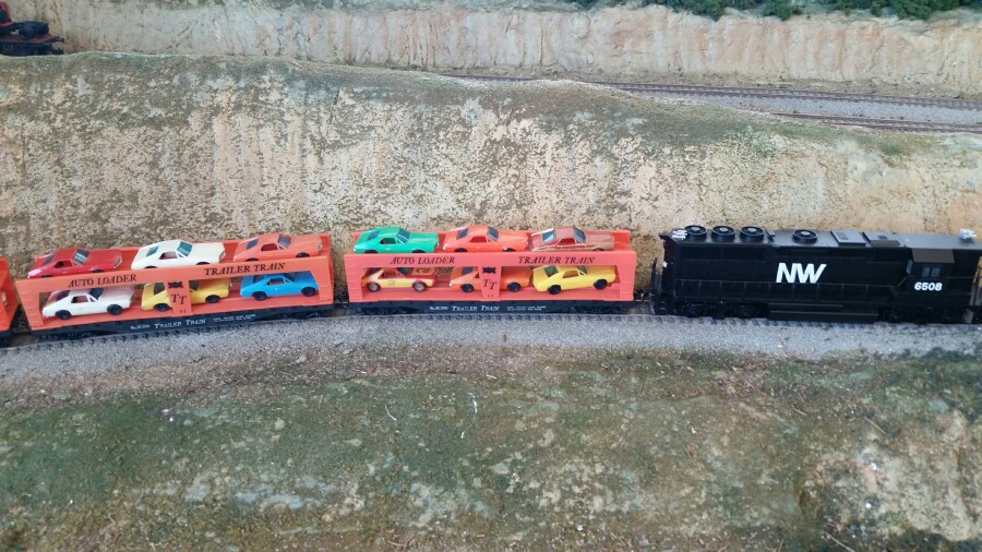 Those Athearn trucks and kadee's really helped make these cars work well now. Took a bit of work to get them this far, but I'm happy with how they've turned out. While the original racks came with 3 Camaros and 3 AMXs, I scrounged and changed out, so all these cars have AMXs on them now. I will probably put the Camaros on the stock Tyco units. So it was a good day, with both projects turning out well and running fine for the most part. Will call it a day and be happy.