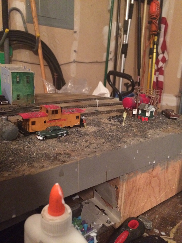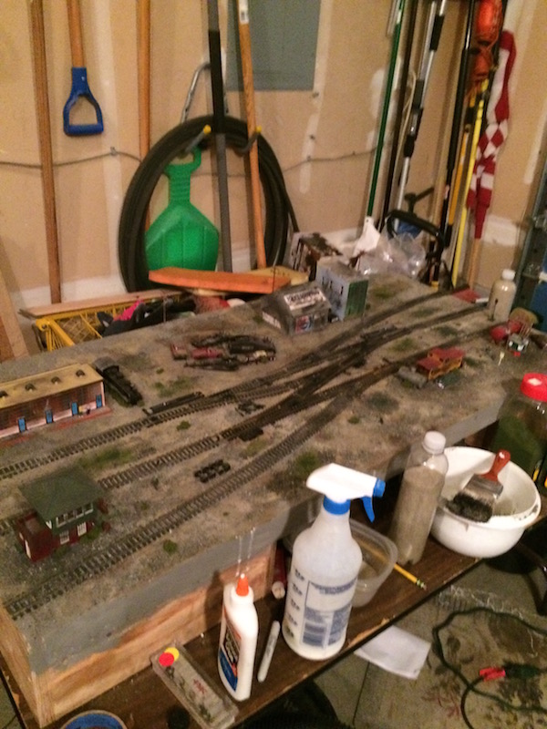 I finally finished up the dirt on the switching layout. The next thing I'll do is bushes.