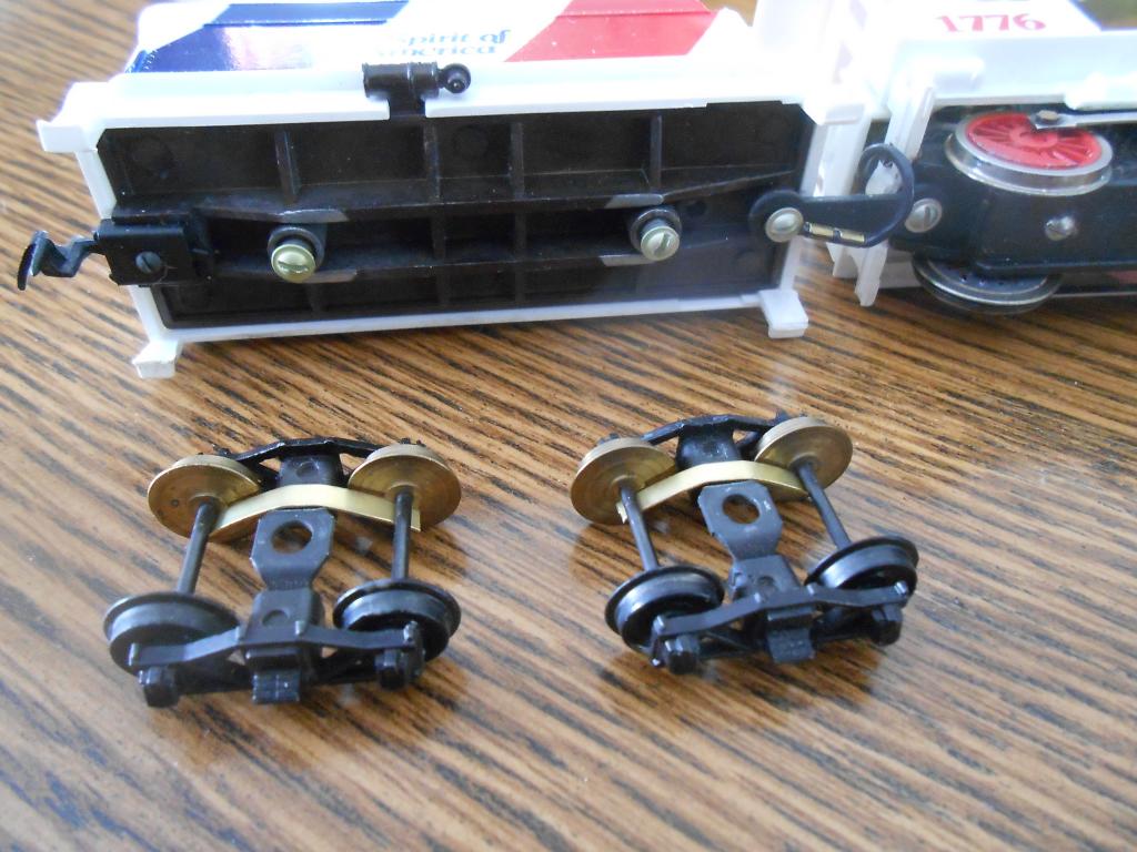 I was tired of the flickering headlight and poor performance of this engine. It's one of my favorite engines and I believe one of Tyco's most handsome. So before the snow started flying today, I went to the LHS for some brass wire. They had none so I settled on 0.016 brass flat stock and fashioned some pickups. They're resistance fit in place with 24 ga. stranded wire connected to a brass contact plate. No more flickering headlight and much better performance. I didn't realize how badly this engine was running before today. Now she can be run at a creep with five 50' passenger cars in tow.
