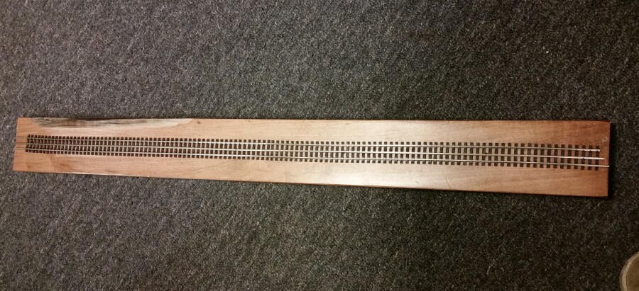 Turned out OK, it's a bit wavy, but nothing that will cause the center pick-up shoe to derail, I don't think. Overall, I got a nice 30" section of one-piece 3-rail test track to use now. I had the mini spikes bought from an estate at auction, only question was would the wood be too hard to penetrate? Luckily, this 2nd piece of wood I tried was soft enough to accept the spikes, although I ended up bending 30% of them trying to nail them down anyway. Hazard with scale spiking, I guess. :) Somewhere I think I have the correct tool to do it, but it's whereabouts at home are unknown at the moment.