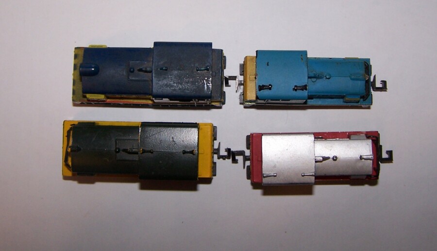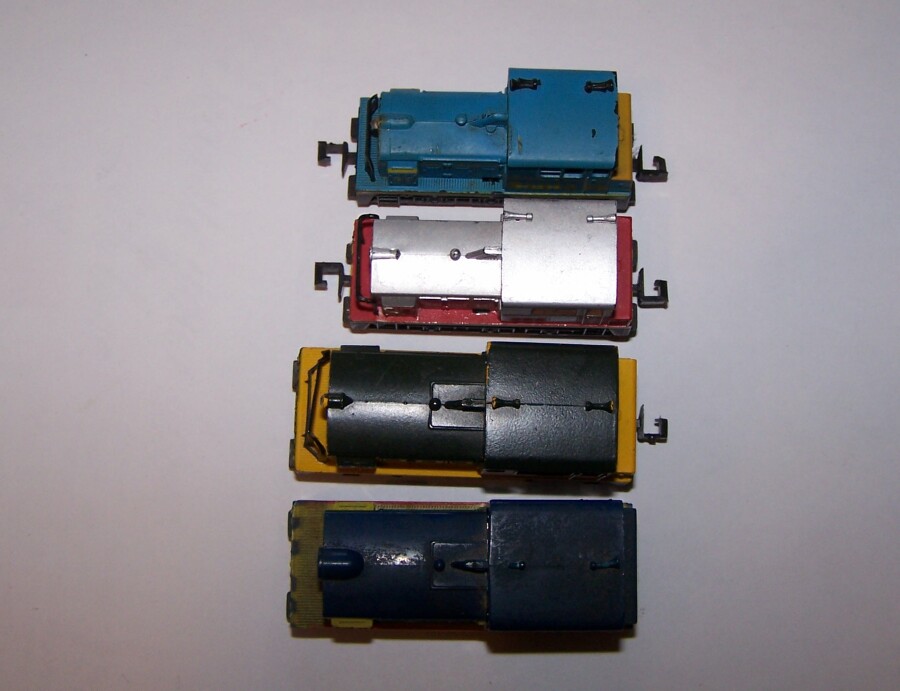 On the left, the Atlas and Bachmann smaller diesels have a similar flat square motor, with the Bachmann surprisingly having much nicer worm gear . It also lacks factory weights, someone added one up front,I will probably add a cab weight as well. The two larger switchers, the Aurora and Liima, have nice factory weighting. For their size, they have a nice heft to them, the Aurora weighs in at 2.5 ounces, the Lima at 2.4. The blue Atlas, however, even with my added weights, is only 1.3 oz, the Bachmann with only one small weight is 1.2 oz. Quite a big difference. Then again, the two bigger engines have more room under the shell, as they are way over scale. But I still like them.