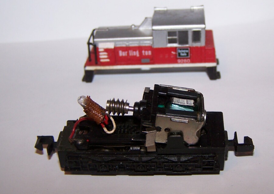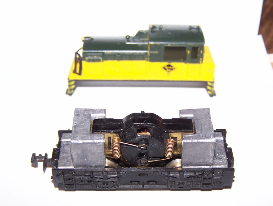 Above the red Burlington Bachmann basks openly now. I've already removed one brush and spring. The armature pads need cleaning, they have oil on them ( not from me ). With the Atlas, I could hand-pull the worm gear off, and I totally disassemblyed THAT motor and cleaned everything, this one will be far harder to do that. Will try to clean them off without further disassembly. It would barely move, even when nudged on the track. Hoping it will be as good a runner as the Atlas once cleaned up.