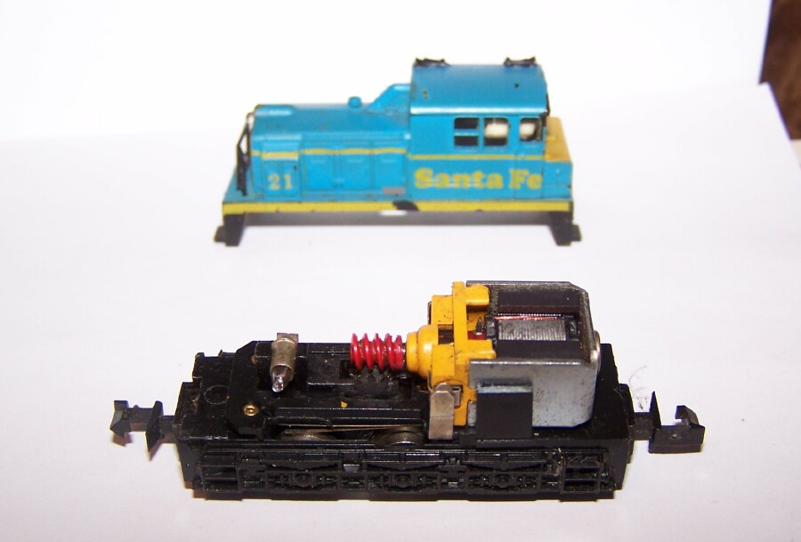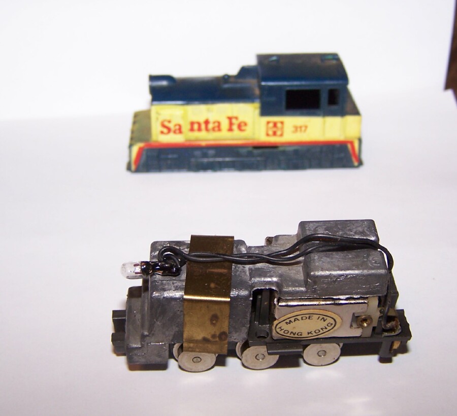 Above, the yellow and blue Santa Fe by Aurora is a hefty piece, the weight is well-designed to fit under the shell. When it ran, before I lost a brush, it was a fast hauler! Needs a light shield in the top of the shell, though, it was glowing like a blue Rudolph going down the tracks!! The Atlas engine light did not shine through except through the front bulb lense. This one is fairly noisey going down the track too, but not coffee-grinder loud, I don't think I greased the gears before I lost the brush,so not sure how quiet it will eventually be.