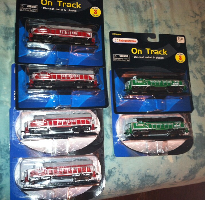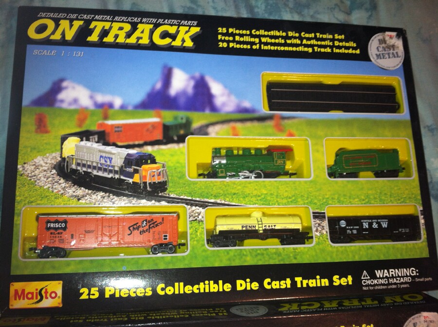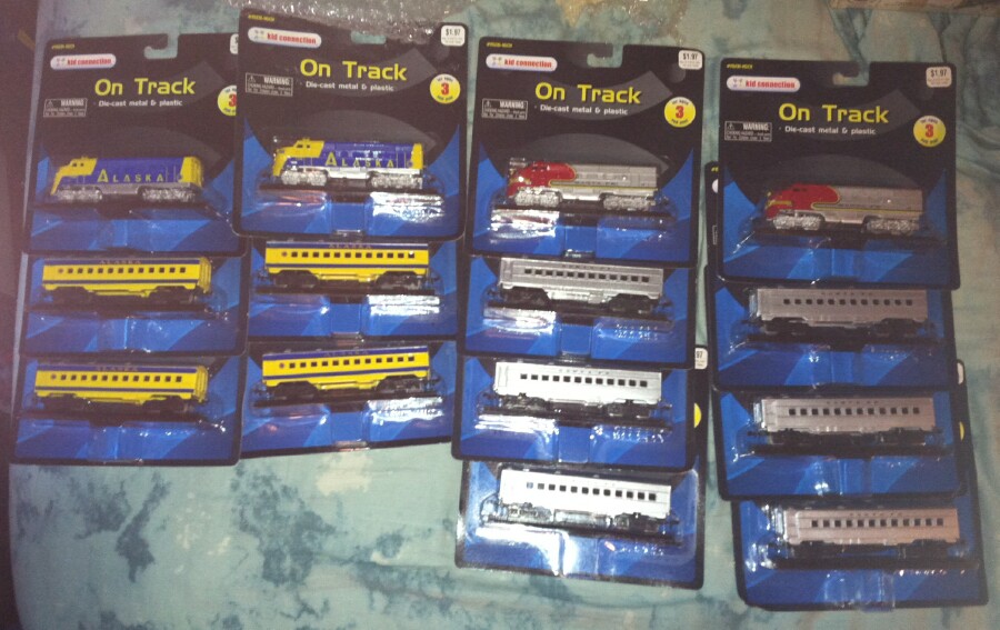 These were produced in the mid-2000, around 2004 maybe? Found at Wal-marts mostly, single pieces, I found the sets somewhere else. I don't know if it ever caught on, as with Wal-mart not selling the sets, you couldn't get any curved track for it! Doesn't make for a very good play toy with no track easily available. Anyway, I wound up collecting quite a bit, as I have a bug for TT ( 1:100 scale approximate ), so wanted to try to convert these at one time. I did eventually find someone on Ebay in the Orient selling TT trucks and axles, so I bought some, and they work fine. Now if I could find a working 12mm diesel chassis, I'd be happy! At any rate, here's my collection, I do have more, but this is what I found while cleaning up one storage area, and I documented what I had there.
