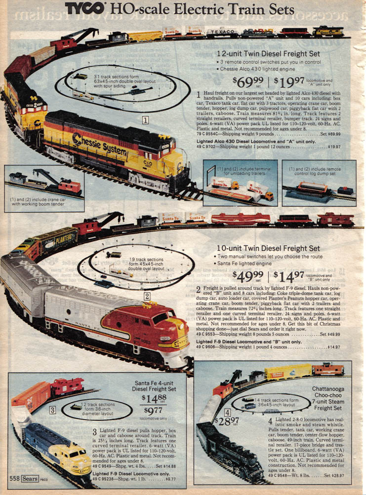 Thanks for the warm welcome! My F7 had the same paint scheme as the ones Evan has. The caboose was painted to match. I remember in the catalogue it said "Only at Sears" and it came in a plain white box. It had the 50ft green Burlington Northern box car, a yellow Union Pacific gondola with culverts, and the Sante Fe piggyback car with the unloading dock. I've been trying to find online versions of the Canadian Sears catalogue and could only find the 1979. I think I got this set about 1975. Speaking of the Sears catalogues, here's a database of many U.S editions. Lots of Tyco sets in the toy sections! http://www.wishbookweb.com/