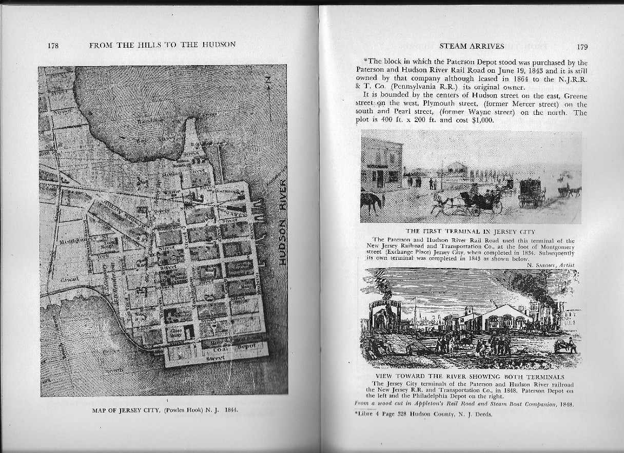 A Pennsylvania railroad book printed in 2001 full of information of a trip made in 1871. ** " Traveling the Pennsylvania Railroad ". The PRR wished to record historical the state of their railroad in 1870. A noted photographer of the time one William H. Rau. was commissioned to record in photographs views along the entire PRR system. He used state of the art equipment for the time. All photo negatives were on glass plats. His set of photos have appeared on display in galleries throughout the country and Europe. They are direct and precise renditions of the past. They are so direct and precise that they can become boring to look through. Very few of the views record life at that time. Most are of the railroad system as it was. I got the book almost a year ago. I looked through it then and haven't opened it since. * My interest in stations and terminals has always been . A ongoing search for the interesting one. Always looking for information on old stations of my area favorite railroads. I purchased a book titled "Train depots and Roundhouses", by Hans and April Halberstadt. A 2002 printing of a picture book. it is mainly a book on preserved buildings and those that should be preserved. It does lean towards the Architectural aspect of these buildings, and in that makes for a interesting book. * A second stations book is A reprinted had cover copy of the 1916 "Passenger Terminals and trains BY John A. Droege. A third printing of the original edition. A good book not because of at the time of printed it saved information on old original railroad buildings, for it did no such thing. What it did do was save 1916. It saved places and what they looked like in 1916, all around the country, and spoke in the Architectural terms of Walter G. Berg. * A third newer book of 1996, " Great American railroad Stations by Janet Potter is a larger book of small pictures of many, many, stations. Some are Historic photos. To bad no book like this ever give dimensions for the buildings, and floor layout plains. Still a good book. Another station book is " The Railroad Station, A Architectural History", by Carroll L.V. Meeks. A 1995 book with good to great info. * With my search for old information on New Jersey Railroads, two book I have recently acquired, One just in the mail today are. " Railroads in New Jersey, The Formative Years, by John T. Cunningham. A 1997 book that wonderfully fills in the early history of Railroading. A informative and color full book. * As I said today a book arrived. A small hardcover 1944 printing of a first addition of " From the Hills to the Hudson". by Walter Arndt Lucas. The History of the Patterson and Hudson River railroad. How I feel about it is " It is the Best book I got ". I never thought I would find one. Definitely not a picture book but a history book. A good one. Here is a 2 page scan of a 1884 map on the left side page, and two views of the first Railroad terminal on the west side of the Hudson River at New York City on the right side page. The map shows the earliest footprint of the first terminal of the Hudson River in New Jersey. On another map I have seen on line and at the Jersey City library is a 1848 map showing the same building footprint as the 1844 map shown here. It all shows 17 dots. They reference the location and number of Romanesque columns that are partially seen in a drawing in the lower corner of the 1848 map showing of the east face of the old first terminal. The only view of the front of this first terminal.