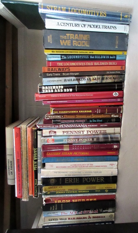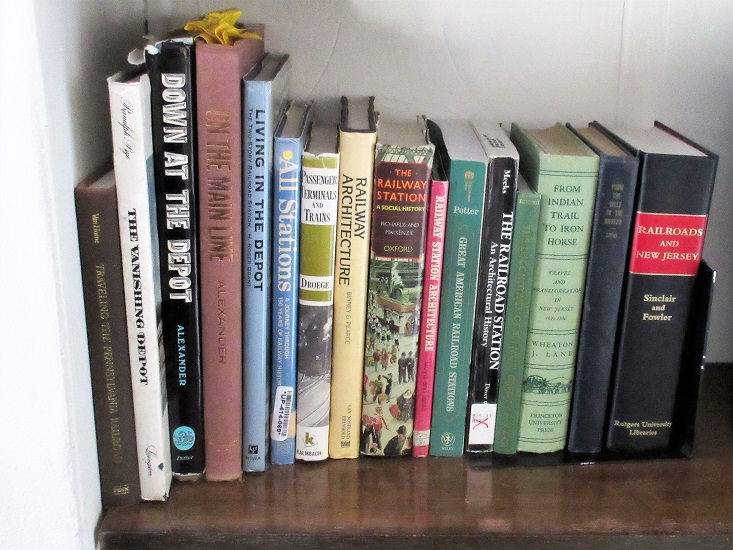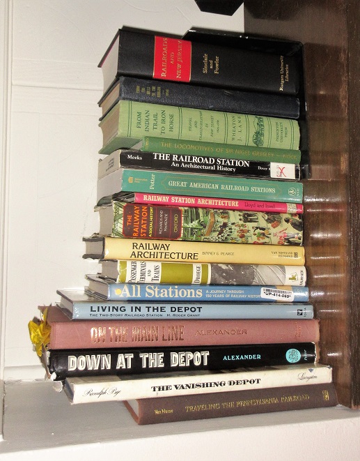 The list of books seen here are, starting far right to left ,or top to bottom ! ( These 4 on New Jersey Railroads). Railroads and New Jersey, A Rutgers Library published index book on information locations. by Sinclair and Fowler . From the Hills to the Hudson by Walter Arndt lucas . From Indian Trails to Iron Horse by Wheaton J. Lane . a New Jersey Railway History Book. The locomotives of Sir Nigel Gresley by O.S. Nock . ( here on on Sations ) The Railroad Station, A Architectural History, by Carroll L. V. Meeks. Great American Railroad Stations, by Janet Greenstein . Railway Station Architecture, by David Lloyd and Donald Insall . The Railway Station,A Social History, Richards and Mackenze . Passenger Terminals and Trains, by John A. Droge . All Stations, Thames and Hudson . Living in the Depot, by Rodger Grant . On The Main Line, by E. P. Alexander . Down at the Depot, by E. P. Alexander . The Vanishing Depot, by Ranulph Bye . Traveling the Pennsylvania Railroad, by William H. Rau .