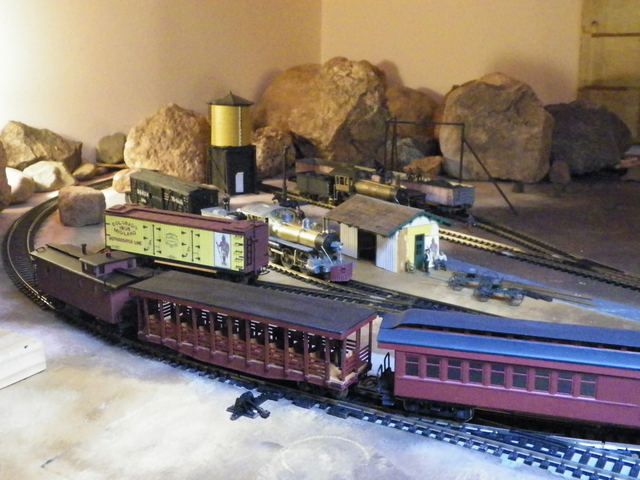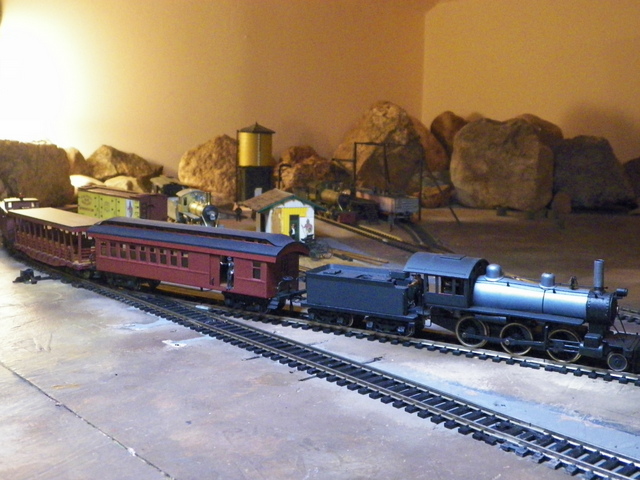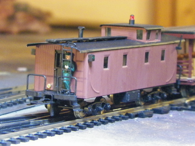 This caboose is part of my effort to put together a "period" appearing excursion train using only Mantua Metal Products equipment. I now have a short version of what I think were typical colors of equipment used by an early local line, the Colorado Midland. This is to be considered an homage perhaps, because they didn't use any 2-6-0 Moguls. "Get what you pay for.", hey? Well I'm havin' fun with it. I think maybe it's the colors that pull this thing together; "locomotive" green (1/2 Brunswick Green, 1/2 Pullman Green; works out to be black with a green cast . . . in the right light), Tuscan on the combine and excursion car, and [Floquil] Caboose on the caboose. And a couple photos around the "work in progress" work bench . . .