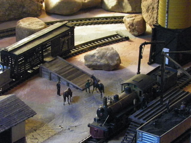 I also like the use of people in the scenery. They make for scenes within the scenes like the guys loading horses at the ramp and the old guy sitting at the freight house, with his thumbs hooked in his suspenders, talking with the man with the cookie duster mustache.