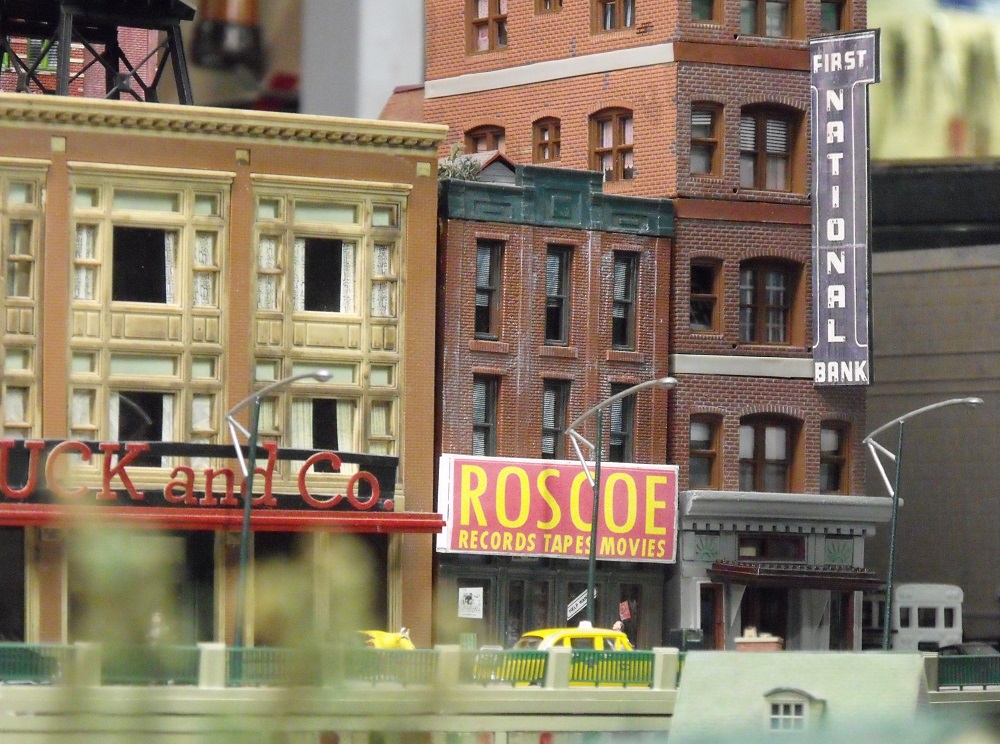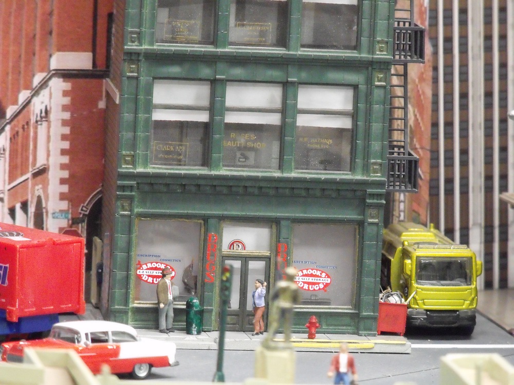Thanks everyone, I'm glad you enjoyed. Pepsi truck came from a garage sale. I thought it looked right. Why the theater at track level? The building fit the spot. It's Smalltown's 'Pam's Pet Shop'. I built the marque and ticket office from scratch. Note the vertical sign is a plastic knife handle. The story I'm going with is when the city raised the road level they saved the theater that was already there. Hollow coffee? It took me a minute to figure out what the heck you where talking about.
