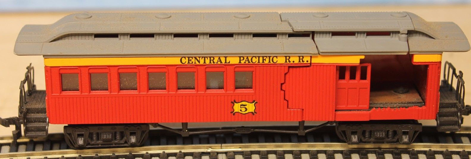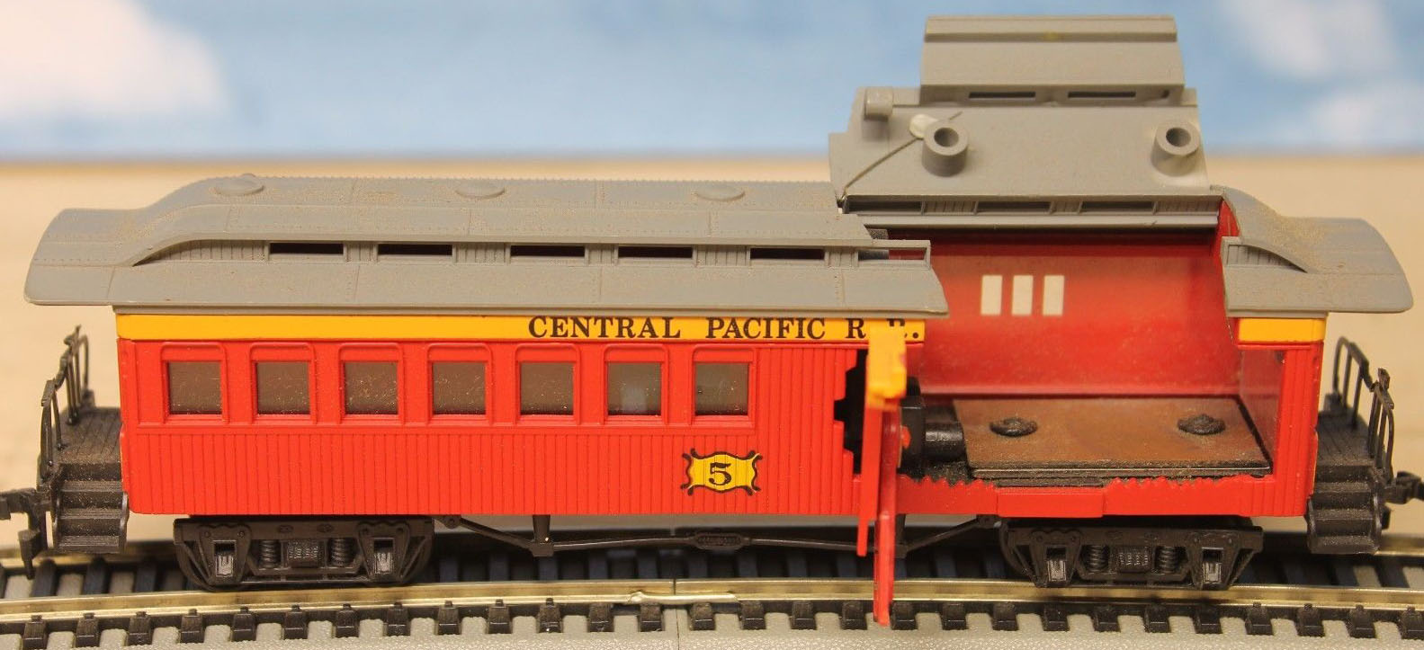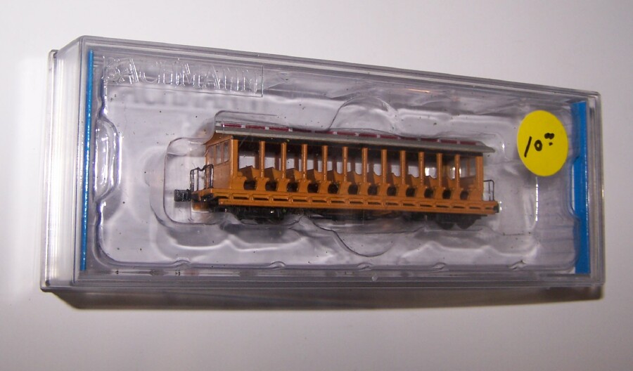 Wow, an exploding Combine! Never knew THAT one existed! I like it. My cartribution this week is an N gauge open passenger excursion car, first I've seen in N gauge. Only $10, so I got it. I have a red one in HO like it, by Bachmann as well. I like these excursion cars for some reason.