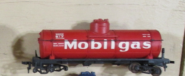 * My car this week is one I thought was a double and for parts. Well due to the way Gilbert made there HO, and there use of Varney for undecorated cars they would paint and assemble them, and sell. I pleasantly found that this car was unique and not a double. Gilbert had there own dies for tank cars. theirs were of a larger than Varney 10,000 gallon car. In many of there cars they sold a certain car like this Number 517 Mobilgas red tank car in both their tank car, and the Varney tank car. I already had the Gilbert car and this new one is the Varney. Got lucky I guess. * Here is the Gilbert/Varney Mobilgas tank car. frank