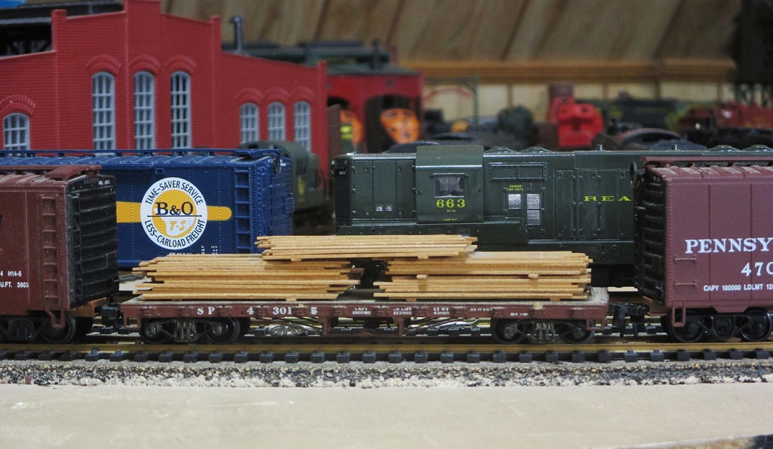 *** Seen here stuck between some Walters PPR box car and in front of a Front Range Reading GP7 is a Train Miniature SP flat with wood load.