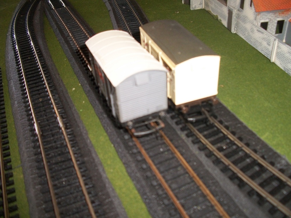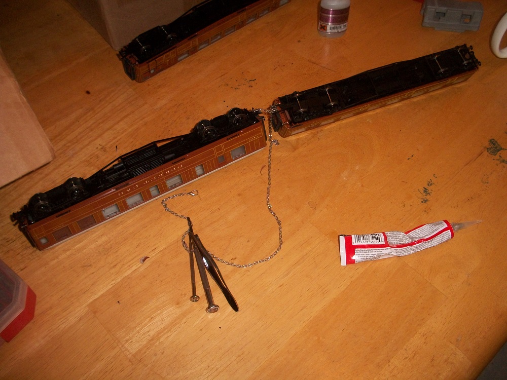 2. These clever Hornby couplers had a cam thing allowing the trucks to swivel on tight curves. Well they didn't. The cam bound the coupler flipping the entire skunk works off the rails. Had to take a deep breath and carve out the cam. One coach had a broken coupler, so had to affix a small bit of chain to permanently couple the two.