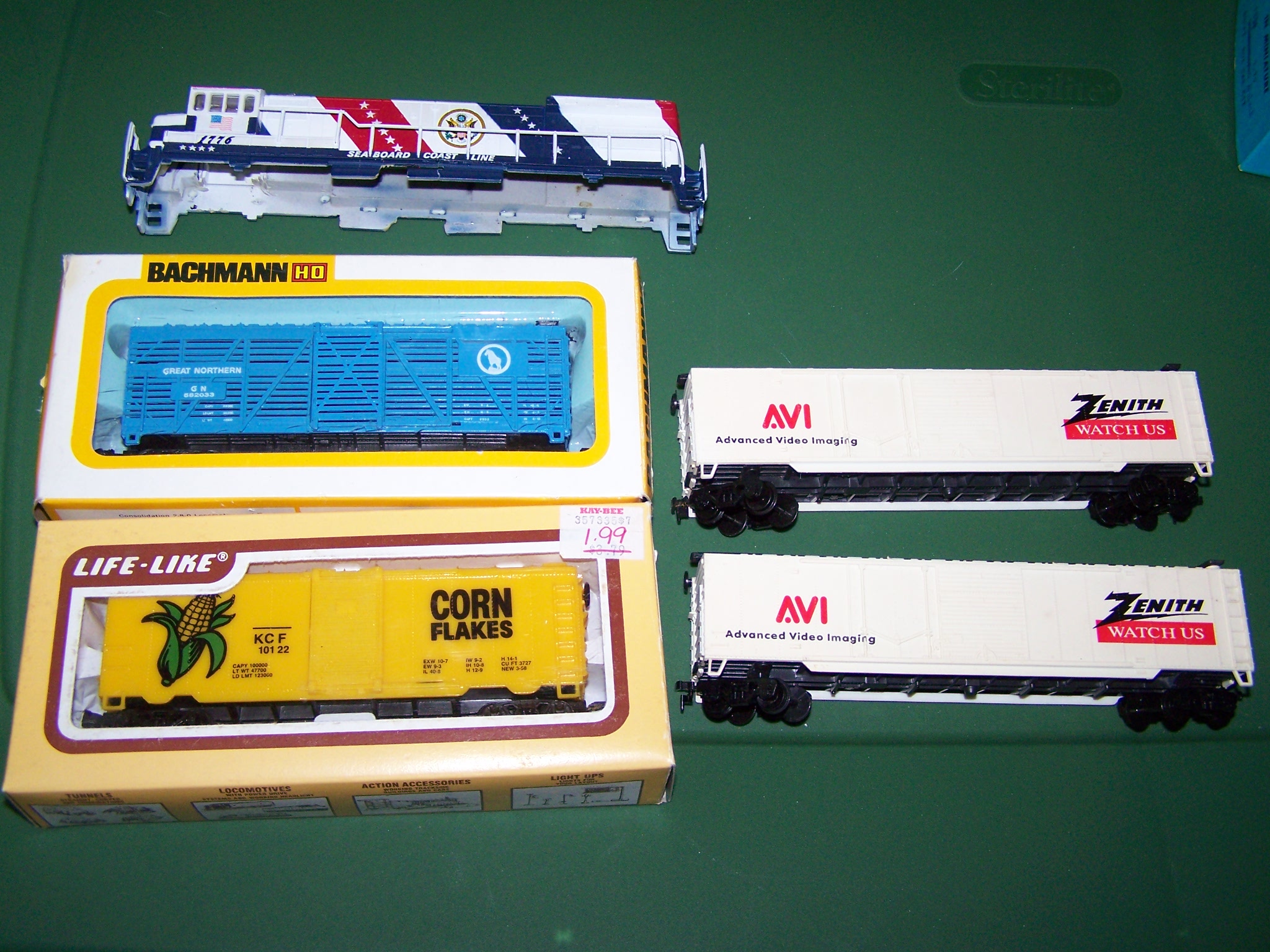 Here are several cars for sale, 2 Zenith AVI box cars and 2 Life Like box cars, a Corn Flakes car and a GN stock car. Also included is a shell from a Bachmann Spirit of 76. Asking $15 for all shipped to you.