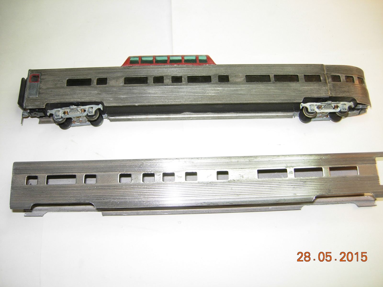Mmmmm...Juicy Fruit. My car this week, a Sampson corrugated streamlined coach. It turns out, this is actually a Vista Dome coach without the dome. This is what it looks like after the first of probably many polishings. Evan