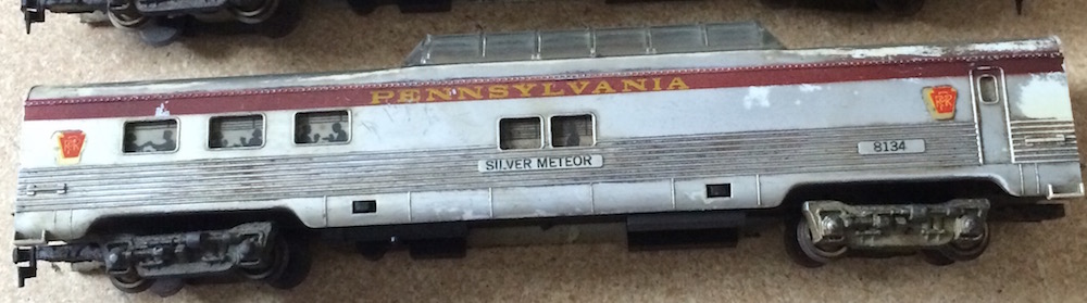 A old 1940's and 1950's Mantua PRR Gondola. All metal construction with printed and embossed paper sides. Old Roundhouse Automatic Knuckle couplers were used. frank