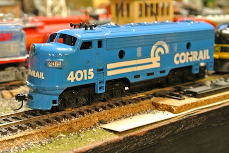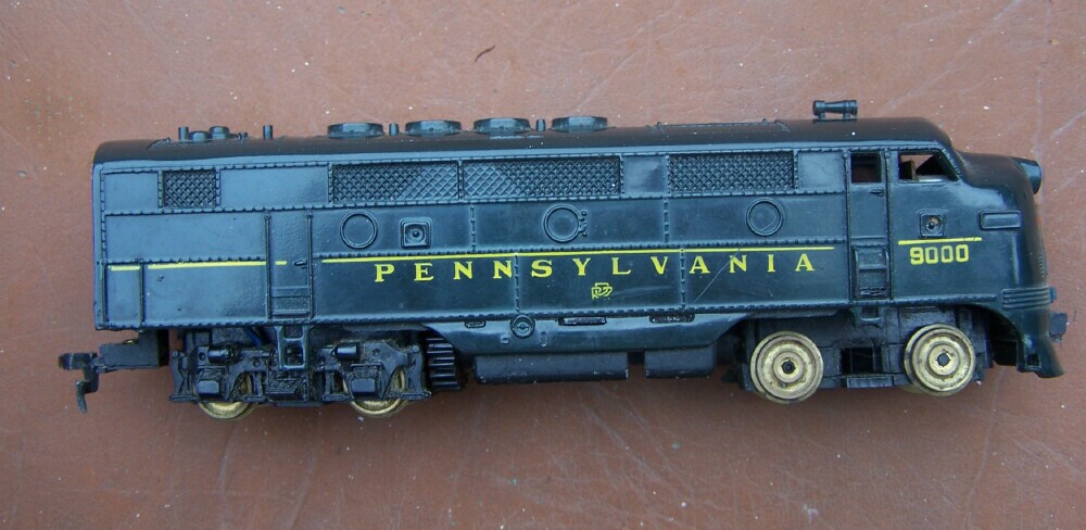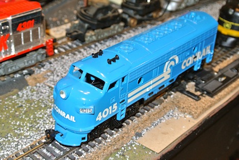 My LOTW is this sweet Conrail F-7. It was a scrapbox find at a local shop and was not running. Found a bad soldered connection, cleaned the armatures with a shot of TV tuner cleaner,bingo, its a runner. Gave the body a good scrubbing with a tooth brush and some mild dish soap. I honestly cant see where this thing had much running time before the solder came loose. Wheels show almost no wear!