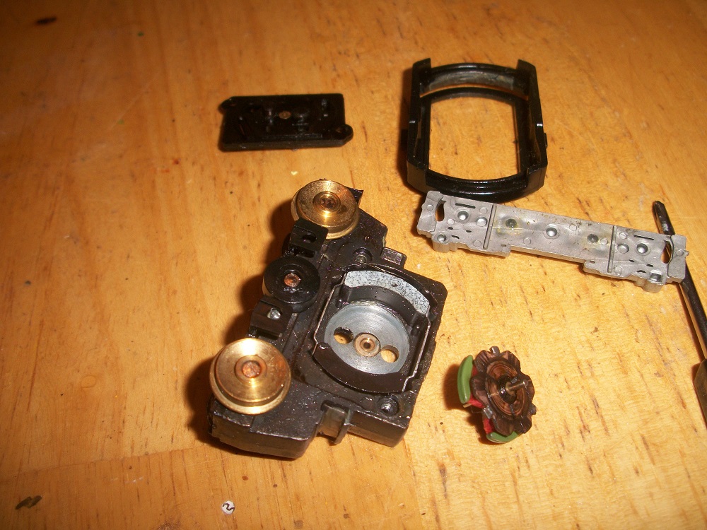The I wiped everything down, particular the shiny, contact part of the winding with an alcohol pad. Getting the bitty springs back into the bitty holes and fitting the bitty brushes on top and then sandwiching the winding back on was a bit of a trial, but everything fit. Put an eensy micro drop of Super Glue on the tip of the pinion spindle, those rotters have a nasty habit of coming loose. Everything turns fine.