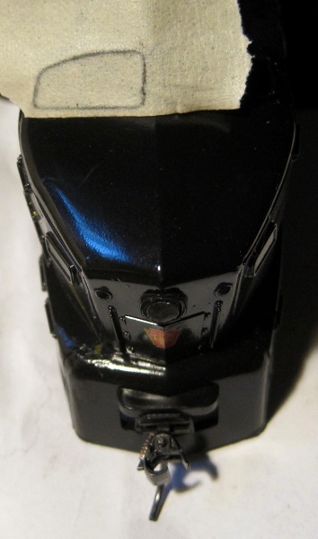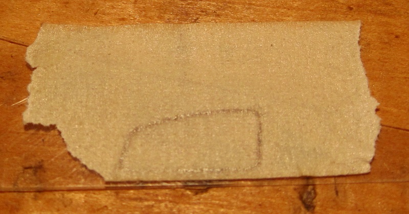 As big as they were, those empty windshield holes were as conspicuous as empty eye sockets, so I cut some clear plastic glazing to fit flush inside the windows. The first step was tracing out the windshield frame on a piece of tape: