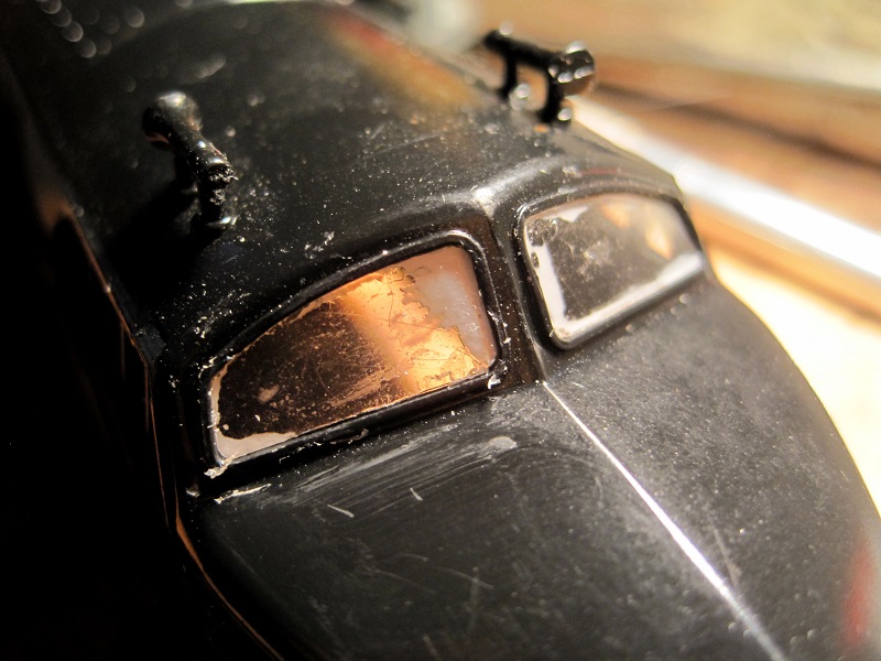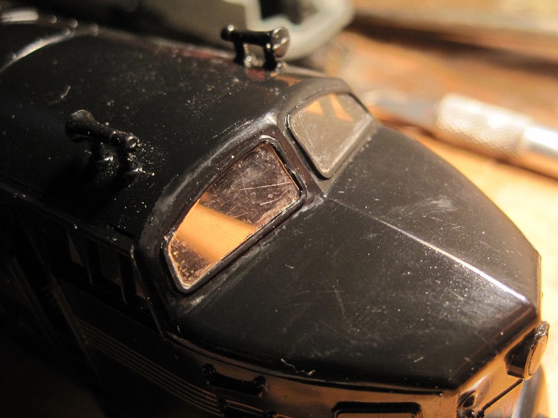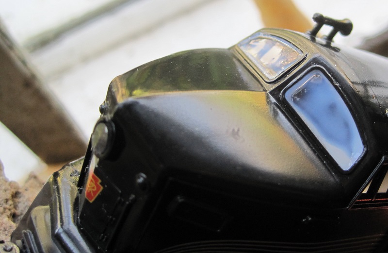 When I got it, it had no light pipe for the headlight, no windshield glazing, no front coupler, a hook and horn rear coupler, a missing traction tire and no fuel tank.