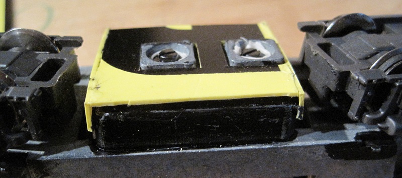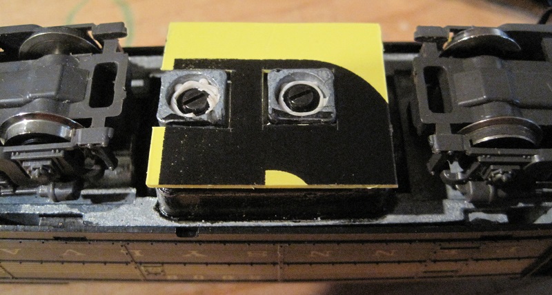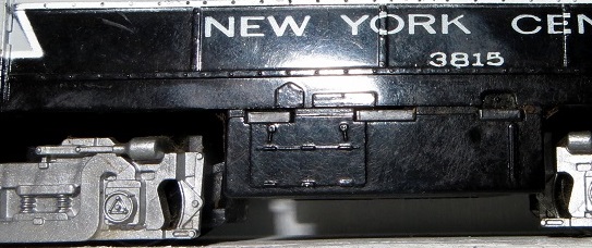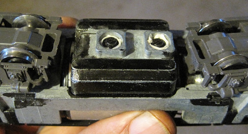 Here's the rear coupler. It's a Kadee whisker coupler with a medium drop shank. There's a thin plastic sleeve from some Kadee installation kit over the pivot point for the coupler, since the hole in a Kadee is bigger than the one in the original coupler: