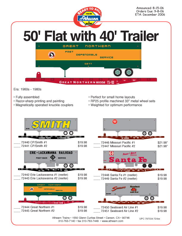 Athearn is doing a new run of 50' Flats with 40' Trailers. They have December 2006 delivery dates and are priced around $20 retail.