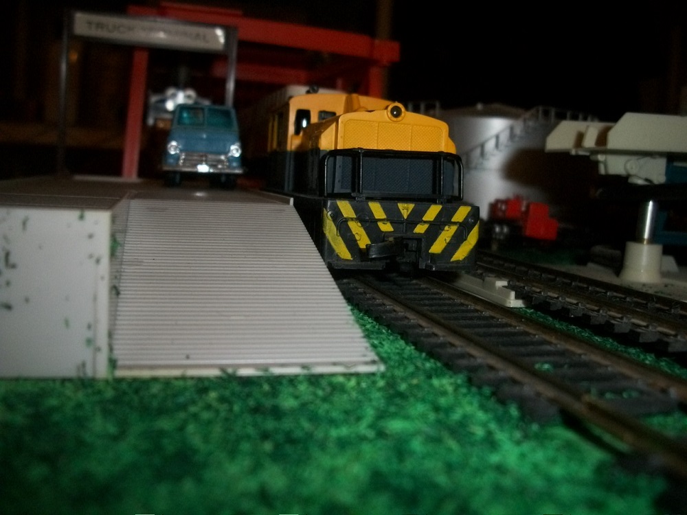 Several views of Tyco Truck Unloading Terminal on Tycomania VI. I really had to shoe horn this piece, but it is becoming an industrial park in an unplanned, organic sort of way. The unloader was $5 in box, missing base. The platform and flat car with pigs is NOS. Christmas 2015