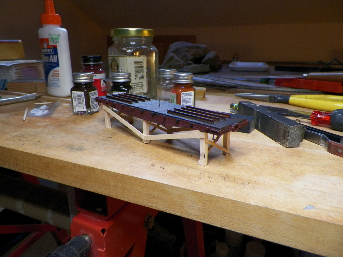 | There's some good tips here; using a pin and cardstock to make riveted straps, drops of glue to show rivets, wooden coffee stirrers. I just found a place a while back that uses wooden coffee stirrers and that's pretty nice scaled lumber for some applications. I'm digging seeing these build ups. One thing I'd like to figure out before my next flat car attempt is how to deal with the stake pockets. On the metal cars I have, these have round openings that will best hold a round wire. On the excursion car, I simply butted up against the stake pocket and because my cuts were less than perfect you see gaps in a couple places where the upright support isn't touching the stake pocket (and also white glue where I never touched up with more Tuscan paint). I'm curious how others may have dealt with this?