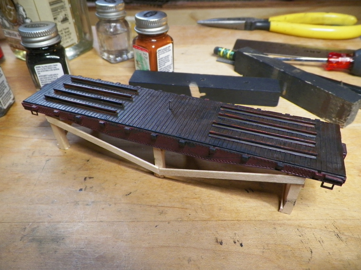 Here's another one of my skid flat kitbashes. It's a coffin style pickle car. I kitbashed the superstructure from wooden tongue depressors and coffee stirrers. I embossed rivets into cardstock for the metal straps. It's painted but I still need to create and print some decals for it.