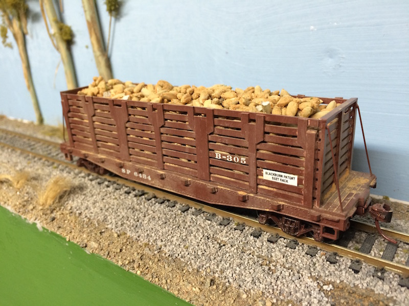 My COTW is a kitbashed beet rack car, now with beets. I scratchbuilt the rack from styrene to fit a Tyco skid flat. The beets are rye seed that I colored with clay that I collected on a fishing trip to Lake Shasta.