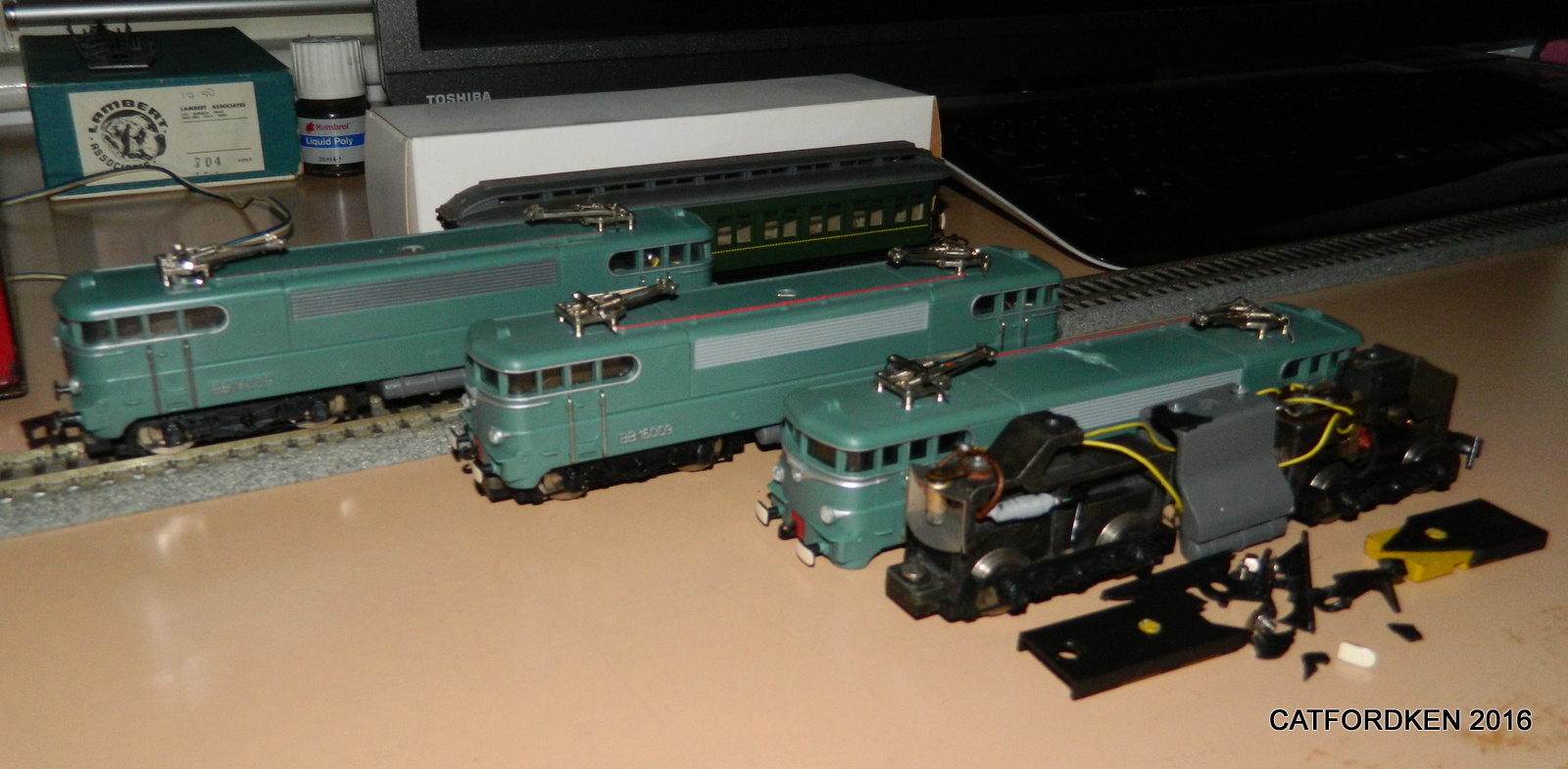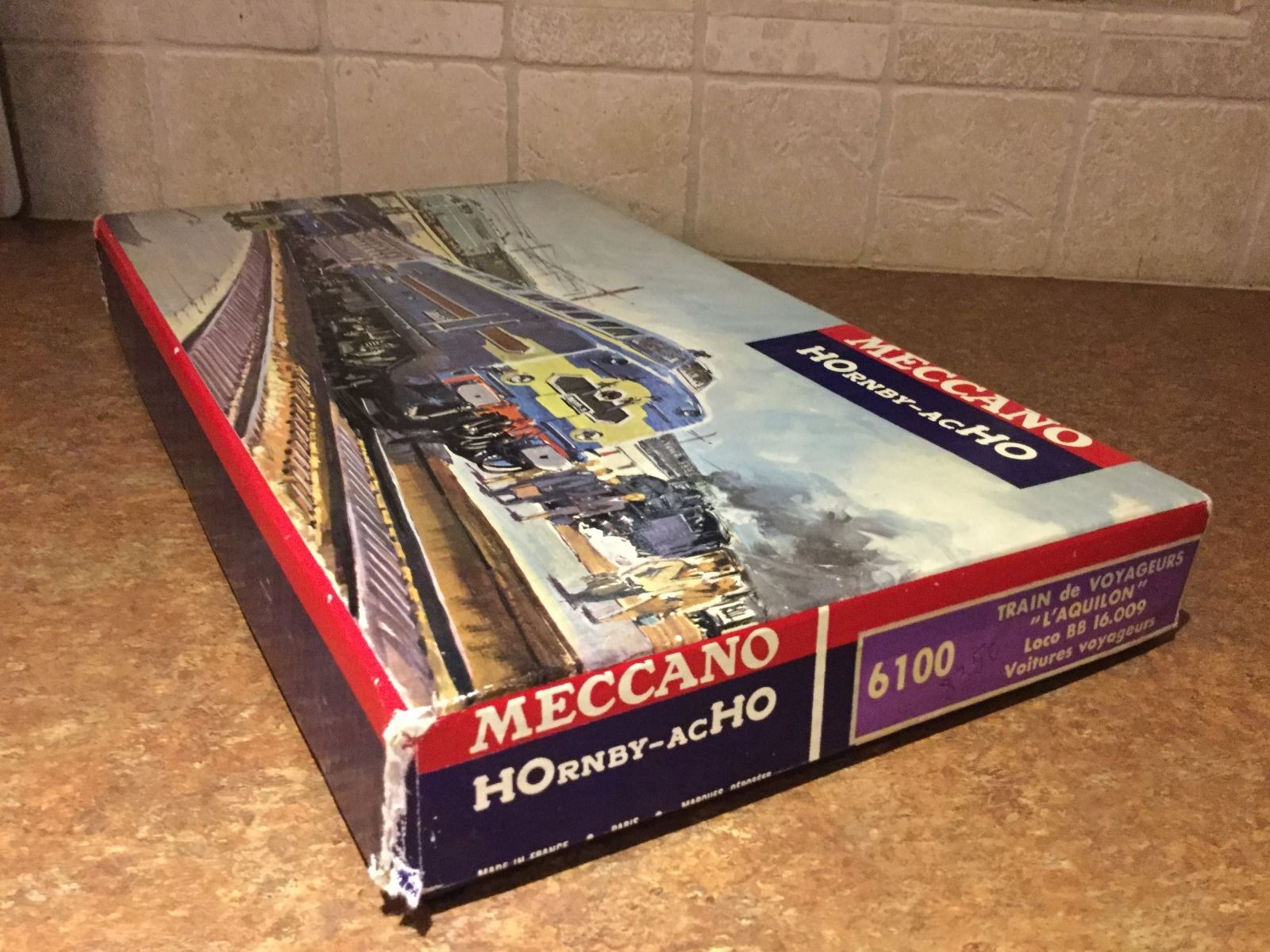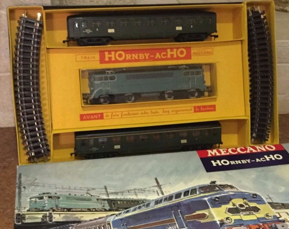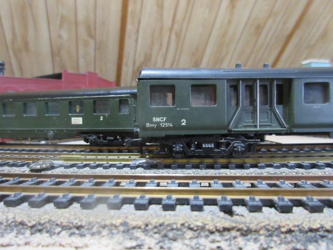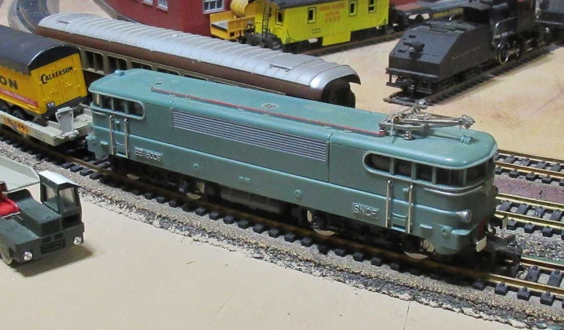 *** HOrnby acHO *** * A line of trains made in France. I think from 1959 to 1970. The line's name is printed exactly like that starting this post. A combination large and small case lettering with the HO term in capitols. The Hornby name is a part of this name. It maybe related to the British Hornby company in some way. * I have a loco and a few cars of this line. Not much of a collection. While inspecting the loco to see is it was a AC powered loco, thinking it was because of part of its name, "acHO," by simply removing the screw through the roof, this was the method of releasing the body from the drive. The motor, has like a DC motor, has a permanent magnet. So the motor itself is DC. A AC motor would of had a winding and not a magnet. So I checked the drive to see if it moved freely and it did so power was applied and the drive turned. * A phot of mine as I purchased it for $30. It does run, but has the ugliest of useless couplers. i will need to look into replacing them with something more compatible. * My locomotive when compared to photos of its type online showed a missing pantograph. The loco should have 2. Also the one that is on one the loco is mounted backwards.