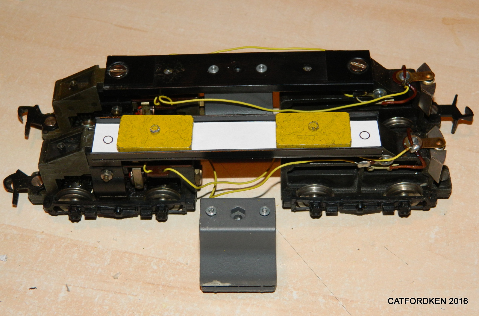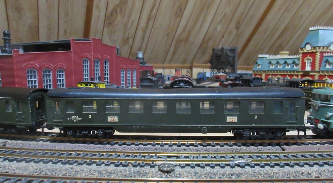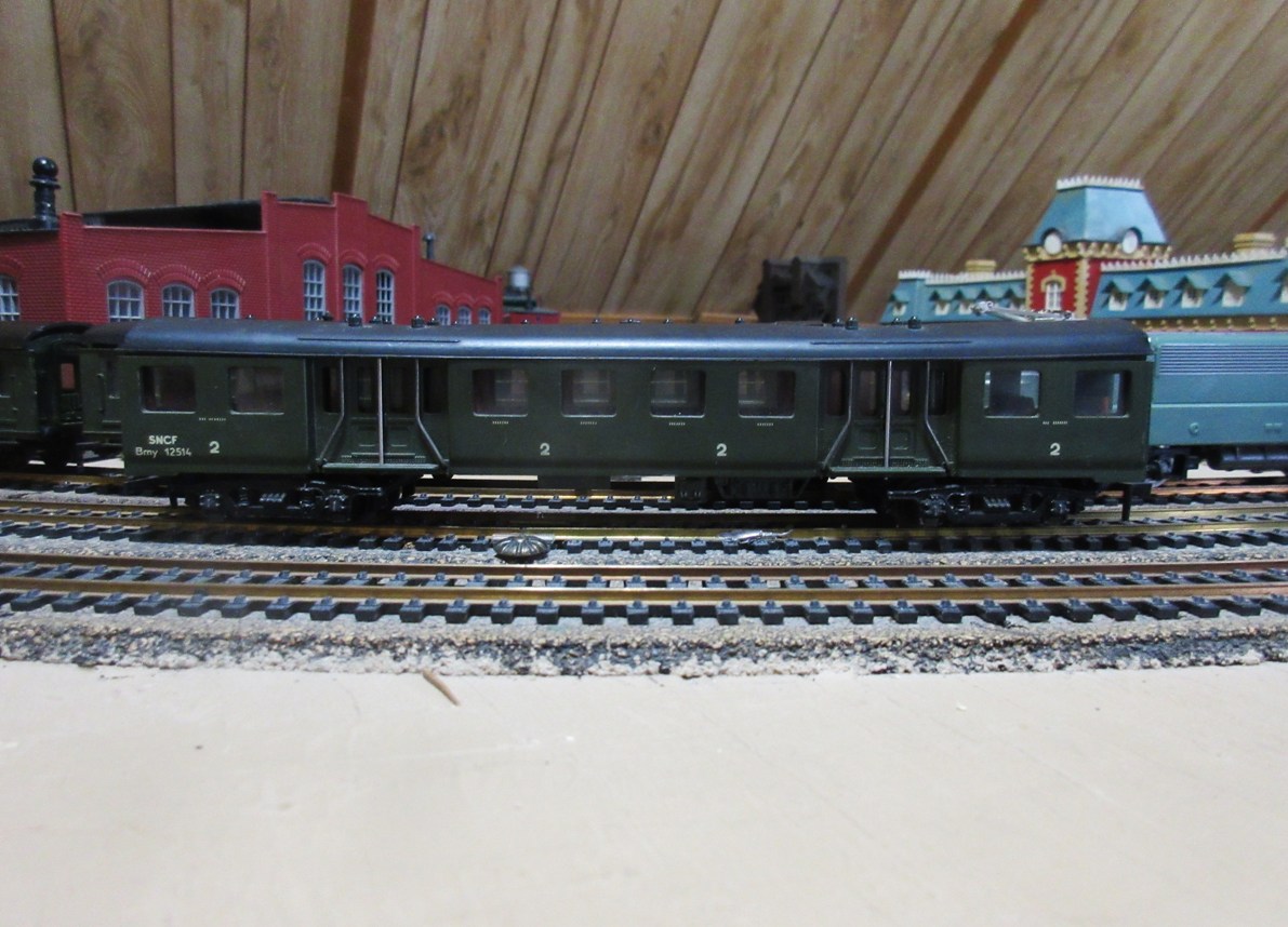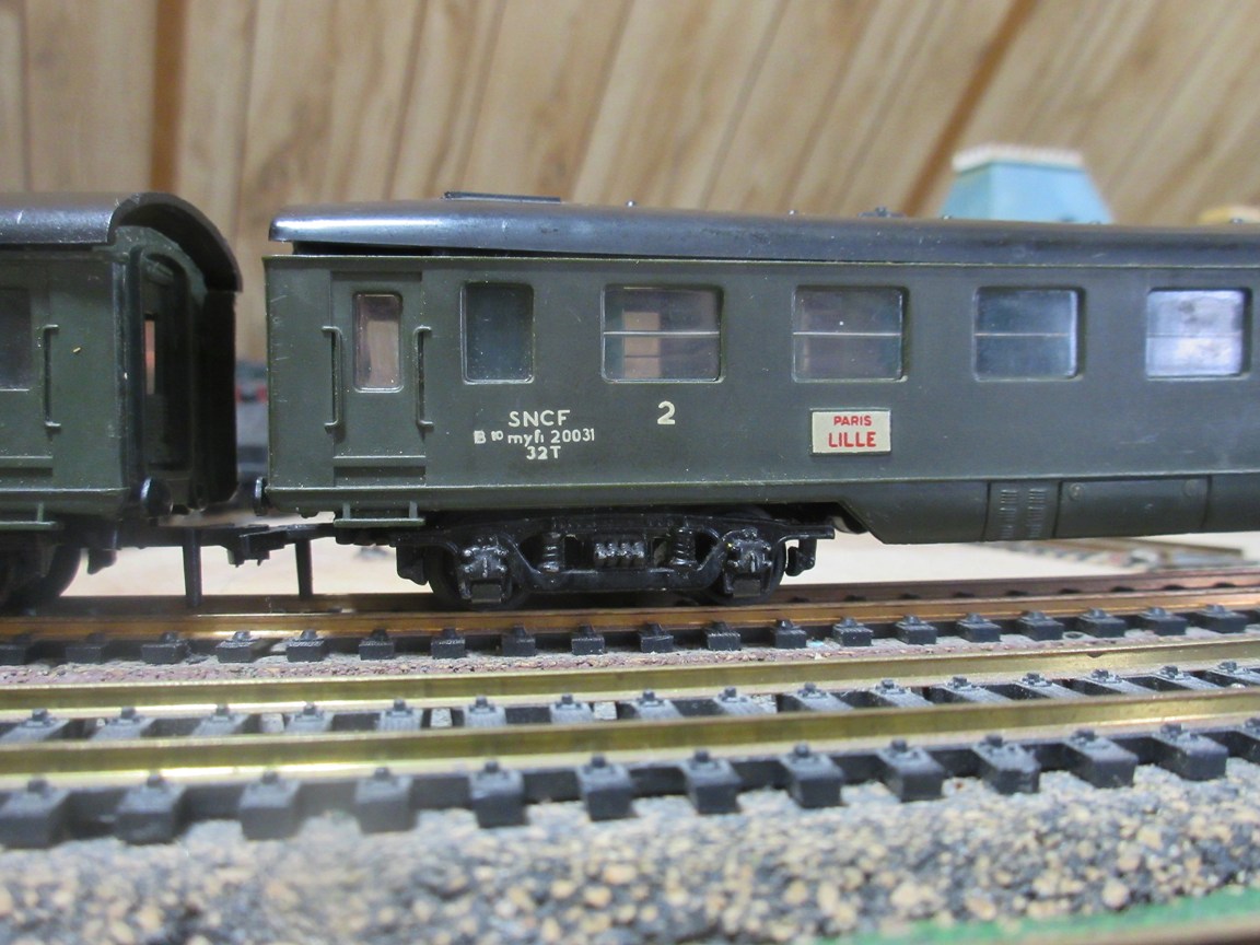 *** HOrnby acHO *** * A line of trains made in France. I think from 1959 to 1970. The line's name is printed exactly like that starting this post. A combination large and small case lettering with the HO term in capitols. The Hornby name is a part of this name. It maybe related to the British Hornby company in some way. * I have a loco and a few cars of this line. Not much of a collection. While inspecting the loco to see is it was a AC powered loco, thinking it was because of part of its name, "acHO," by simply removing the screw through the roof, this was the method of releasing the body from the drive. The motor, has like a DC motor, has a permanent magnet. So the motor itself is DC. A AC motor would of had a winding and not a magnet. So I checked the drive to see if it moved freely and it did so power was applied and the drive turned. * A phot of mine as I purchased it for $30. It does run, but has the ugliest of useless couplers. i will need to look into replacing them with something more compatible. * My locomotive when compared to photos of its type online showed a missing pantograph. The loco should have 2. Also the one that is on one the loco is mounted backwards.