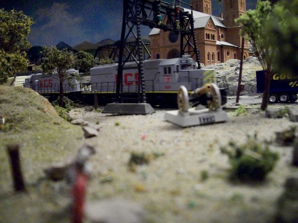 A duo of KCS SD40's pull the 1.5% grade below St. Patrick's Cathedral at the El Paso Model Train Club's layout. I forget who owns these units, but it ain't me. Maybe Moose.