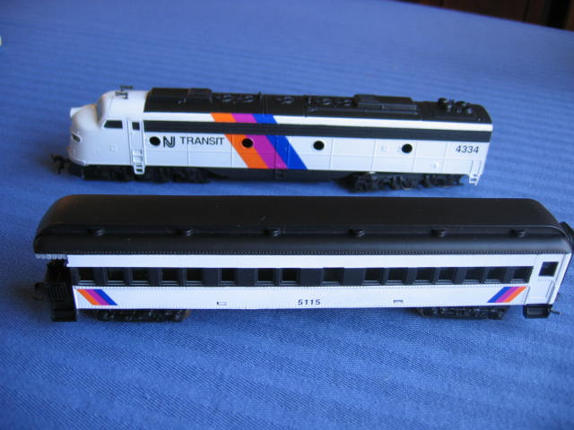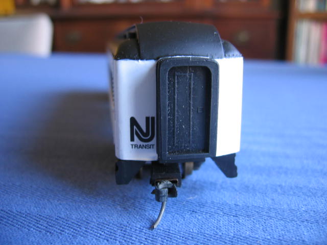I got two of these at a recent show. I wanted to paint one silver and the other white. I am still trying to find a suitable silver paint that can be masked without ruining the silver paint when I pull the tape off. So... The white car got finished first. I used the Testor's Gloss White for the side, Semi Gloss for the black stripe, railing, trucks and base. I used Flat Black for the roof. Then I coated with my Testor's Gloss/Dullcoat 50/50 mix after applying the NJ Transit decals. This car came out so nice I am thinking about painting up 3 matching coaches to make a set for the Rivarossi NJT E8's I painted in white (shown in the background).