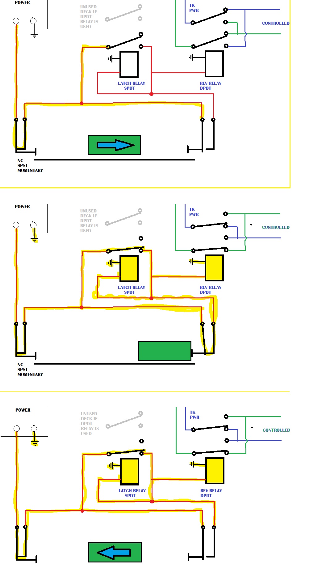 And here is another way you could do it with two ordinary relays. This requires maybe a bit more 'splainin so I added a few images and some cracklin' energy on the wires. If your wires are actually cracklin' with energy they you may wish to stop operating your trains in the kilovolt ranges.