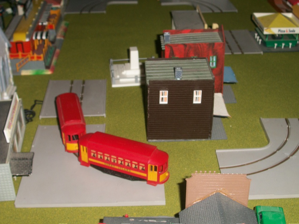 For the inner loop I FINALLY won a Tyco Straphanger Set, and will install that inside the inner loop. To my surprise the set is more of a cool novelty than a serious entrée into the traction arena. It comes with only two straight sections and they are only about four inches in length! To open up the oval a bit, I intend to use the Tyco street car track as a template and fashion my own straight sections with styrene sheets and perhaps some balsa.