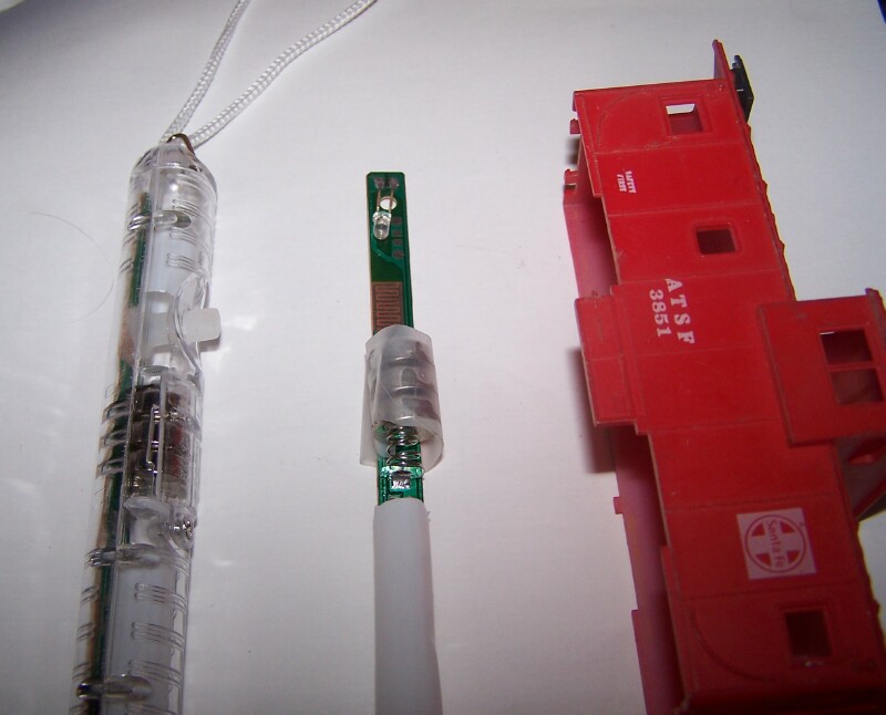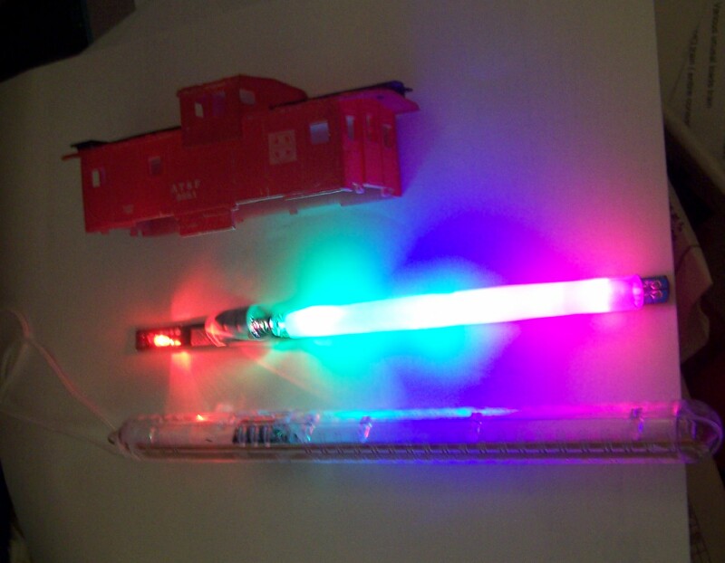 I don't know if any of you are looking for a "cheap" way to light your caboose, or even a small passenger car...but I walked into Target tonight to stock up on cat food, feeding two hungry stray males in addition to my domesticated female cats, and wandered through the Dollar Spot. some neat stuff there sometimes. Not even half-way down the first row, I spotted something - light wands. Hmm. They had different color outer shells - clear, blue, pink , purple, green, etc. For the LEDs themselves , there are 4 : two red, one blue, one green. Tried a clear shell wand, bright LEDs come on, then you can cycle through a sequence of flashing, strobing, sequential flashing, back-and-forth lighting, just keep hitting the power button. Has a little sealed circuit on the long skinny light board PCB to do that. And the nice thing about it is? Only $1 each! I bought 5. SPecs - about 7 inches long, has room for a 5th LED, powered by 3 mini-coin batteries. PCB is about 1/4 inch wide. Could cut it down to 3 LEDs, about 4 inches long, for a caboose. Or leave it long for a passenger car. Has mounting holes at either end for screws. PCB is a little flimsy, but won't sag on it's own. For a buck, not a bad deal to get a pre-made light board, LEDs, and a battery holder, too! The shell is glued/pressed together, I just gently cracked it apart with some pliers to get the PCB out. The "switch" is a rubber "hat" with a metal-embedded dot to make contact with the zig-zag traces to start the light show. Might could use part of the wand shell to hold the PCB and the switch hat in place, or make your own. At any rate, thought I'd mention this thing here, since I'm on a light-it-up phase kick now. :D Would be easy to scrape and cut the PCB tracks to install resistors, diodes, etc for a track-powered light bar. Like I said, only a $1 gets you all this. I've been looking at online light kits for cabeese, and a simple 3-LED is $15, and a more complex 5 LED one is $25. Not exactly cheap money, although those ARE well engineered and thought out. I may buy one to "borrow" the circuitry secrets for these. :) Anyway, a few pictures to enhance the post as well.