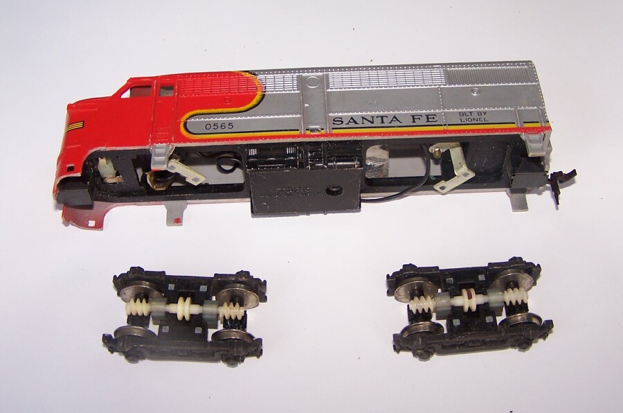 Nice double-ender! I like those. My submission is a needs-some-help Lionel F7, the power pick-up tabs have come off the truck ( welded? soldered? not sure...). Am thinking of a project using this Hi-F style truck to power a caboose or boxcar, ie Haunted Car. The truck design is perfect, uses a band drive, and the motor can be horizontal to drive it inside the car. Or I may fix it. Timonium show find yesterday.