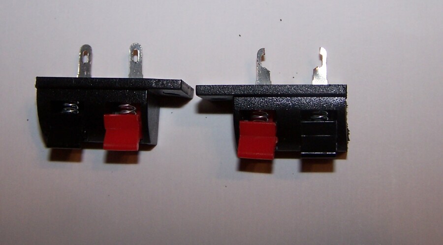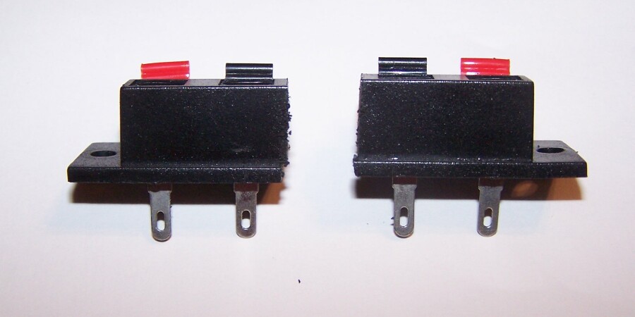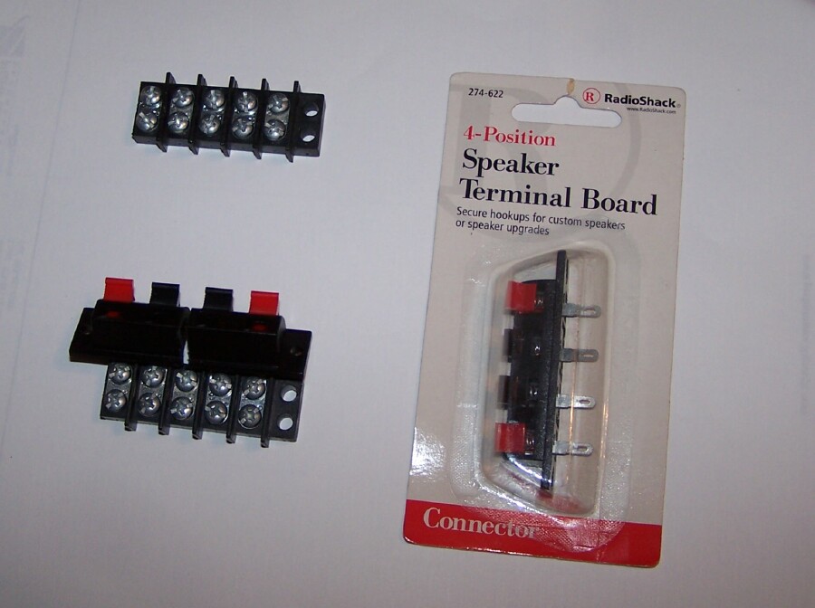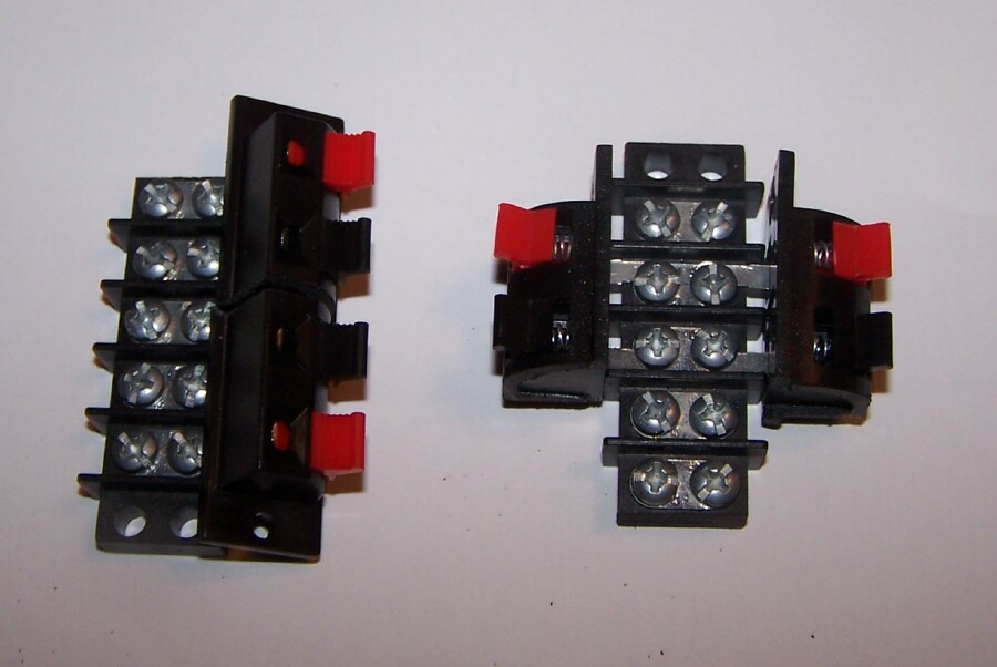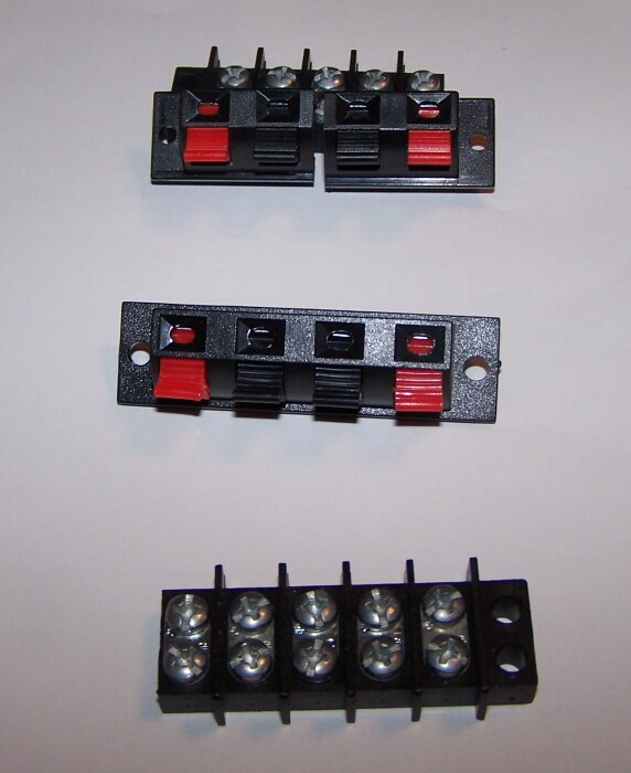 Basically you need two things to do this : a Terminal strip, and a set of speaker wire clasps. I've long thought of using speaker wire clamps before, and had bought some, stuck them in a drawer, and of course they get lost/forgotten over time. But cleaning up ( to clean out some ) I found them again, and with the terminal strips close by, I got busy.