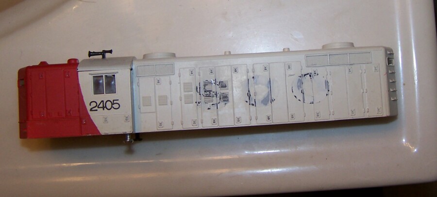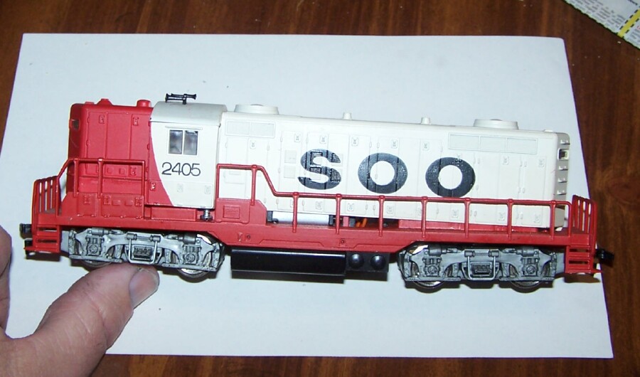 Started working on an engine yesterday to power my AMC automobile consist, and I picked the exact same engine as TheTramp posted last week. :) The motor is already isolated, should be an easy conversion to DCC. I've also started removing the SOO paint with brake fluid , in preparation of an AMC logo / repaint. Motor contacts were dirty, and I oiled the bearings up too, then it started running good. No flywheels on it, but it seems to have good throttle range. Will see how this old RSO made unit does on a layout.