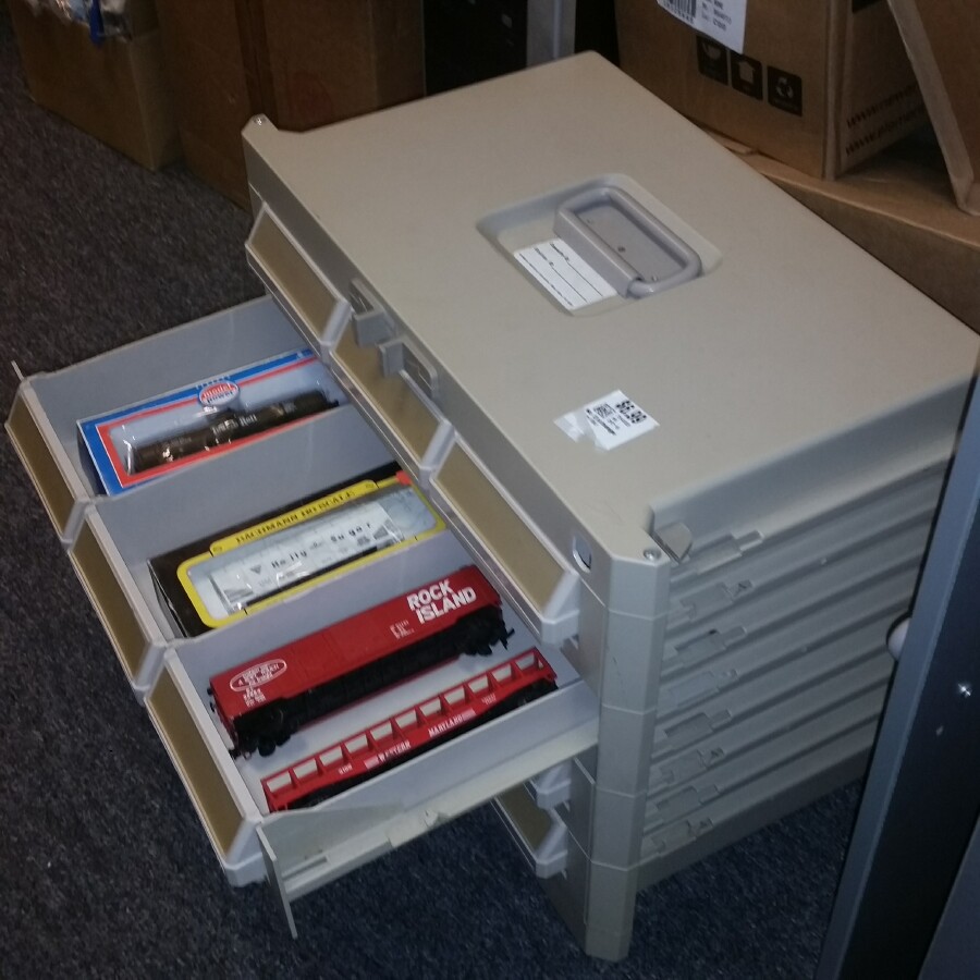 I visited a thrift store last weekend, and found a nifty storage unit, only $7. I JUST did some research on it today, made by Metro, and it turns out it's a lockable unit made for storing medication cassettes. Normal retail price - north of $400.00 , WHOA. I just bought a lock for it today, $21, the drawers are near perfect for HO use, it has a carry handle, and would be great for moving trains around to shows and stuff like that. I don't guess I'll be buying any factory-direct though, not at THAT price. WHEW.