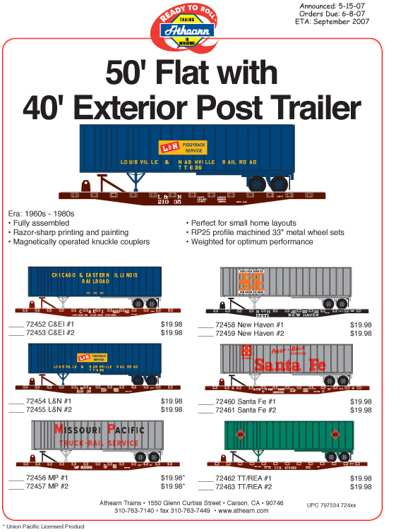 Athearn's very nice 40' Exterior Post Trailers are being put on the 50' Flat Cars...