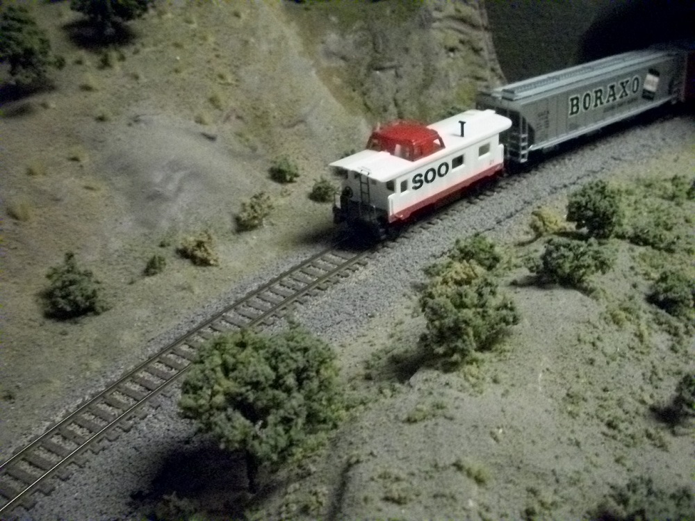 A custom painted Athearn Blue Box I bagged from Tin Plate Henry a while back. Took her off the shelf and here she leads a billboard procession at the El Paso Model Train Club. Realizing I didn't have any personal attachment to the Soo, I tried in vain to sell it on Ebay and the Forum, and gave up and found a Tyco caboose to match.