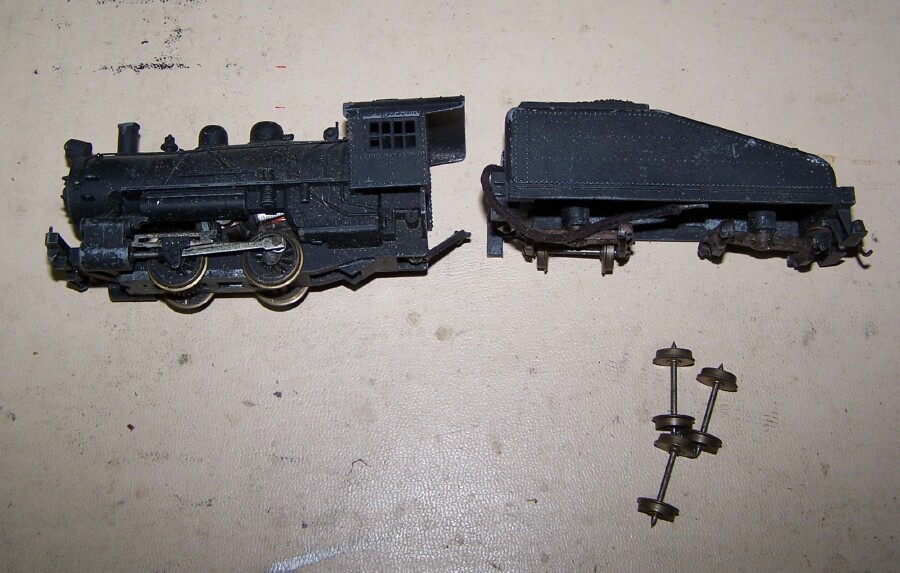 Rescued from a bed comforter bag in a thrift store, in a bulk HO train purchase lot, this Mantua is going to the shop with me today to see if it will run. Engine itself seems OK, tender needs axles put back and the drawbar repaired.