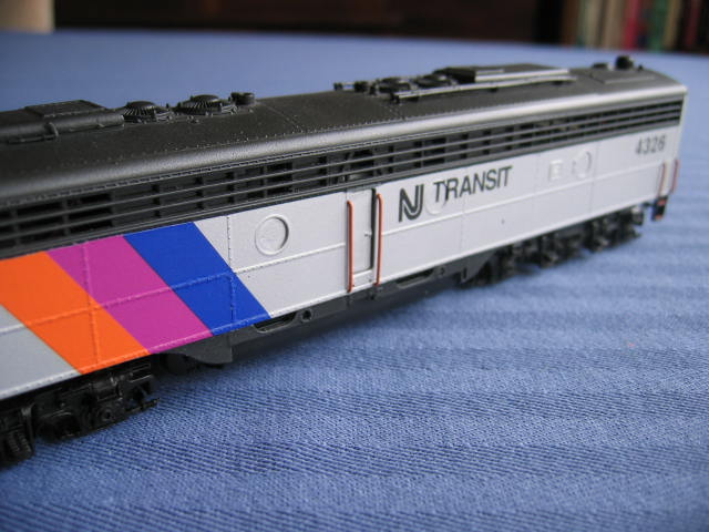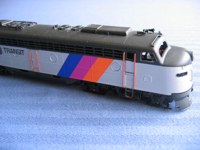 I had a hard time with this project. The paint that was previously used must have contained Tulene which crazed some of the plastic. I had to double decal the NJ Transit Disco Stripes as the first layer had the rivets starting to poke through the decal. I hand made all of the metal hand rails on the engine and painted them Mango orange or Silver. I need the steps below the doors, cab glass and number boards. Below are a couple pics of the real NJ Transit engine.