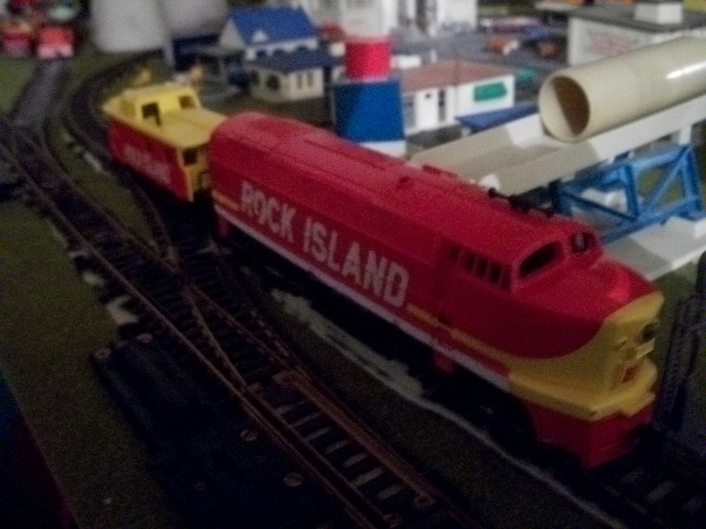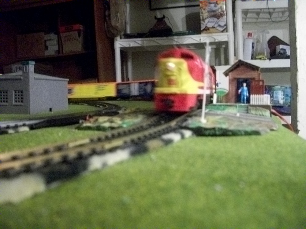 Rockin' with a little help from my friends. Tyco Shark on a refitted Model Power chassis, lathed to fit by Wildecoupe. She will be hauling Tyco billboards by this evening. And here she goes: