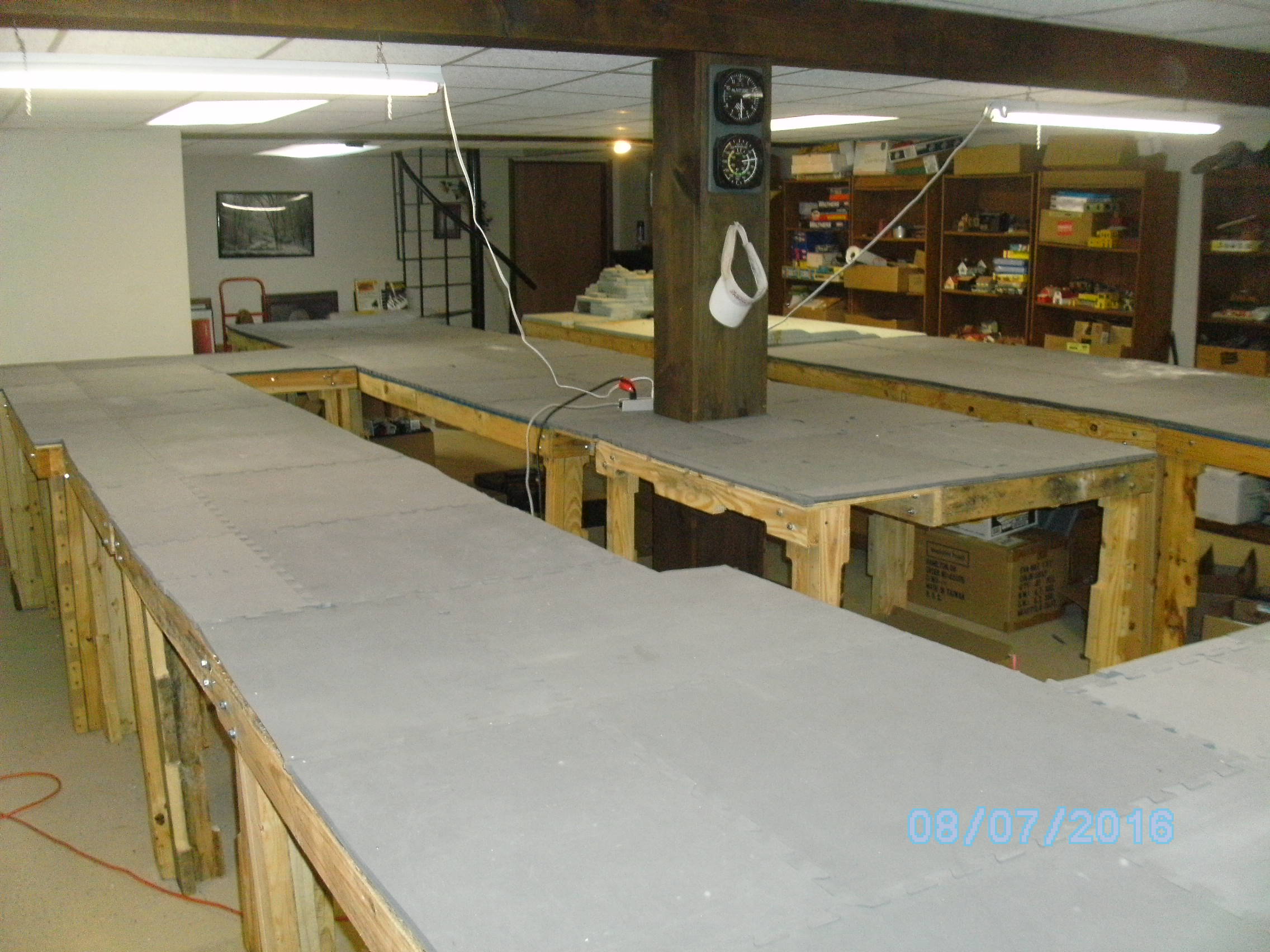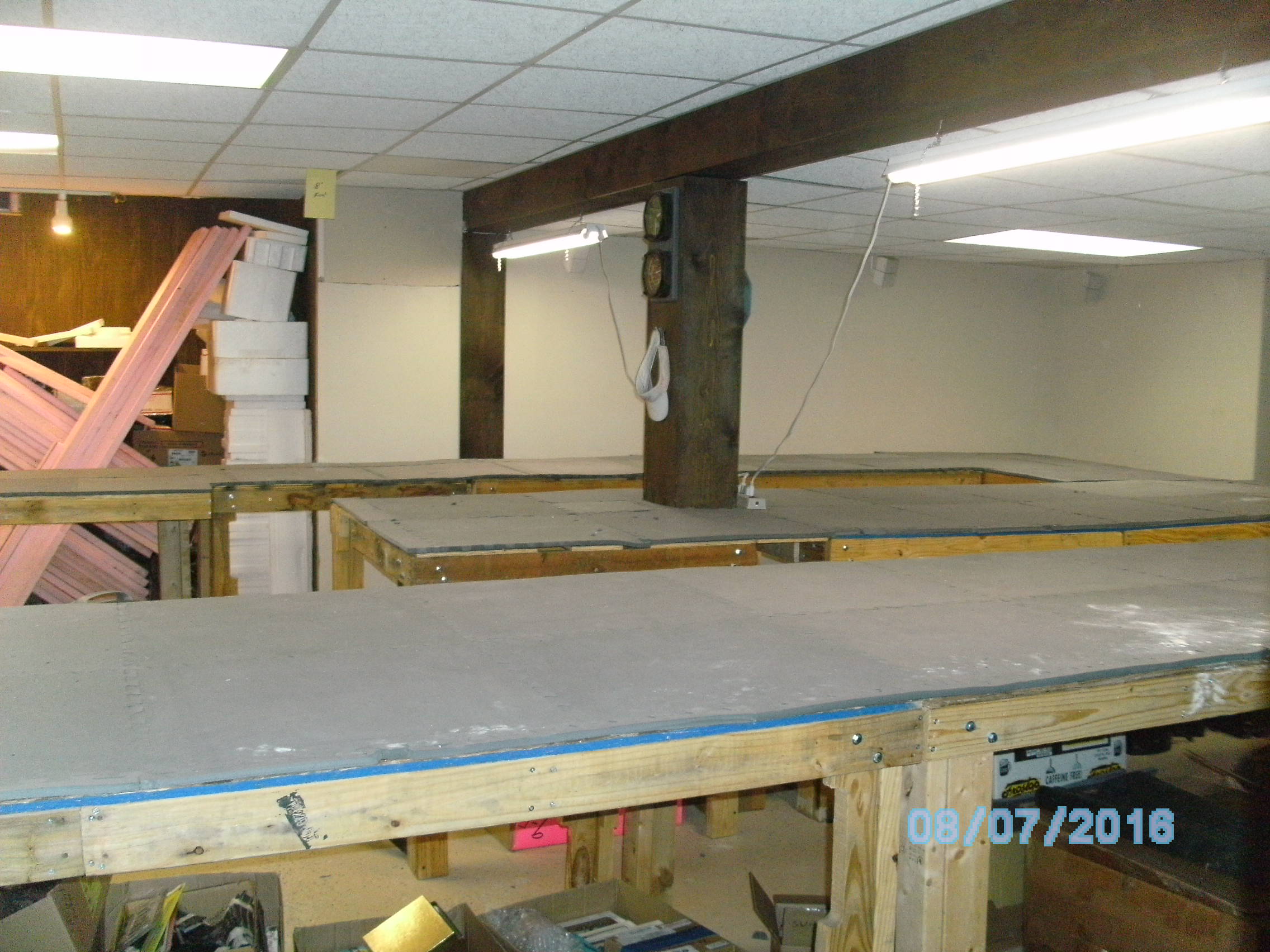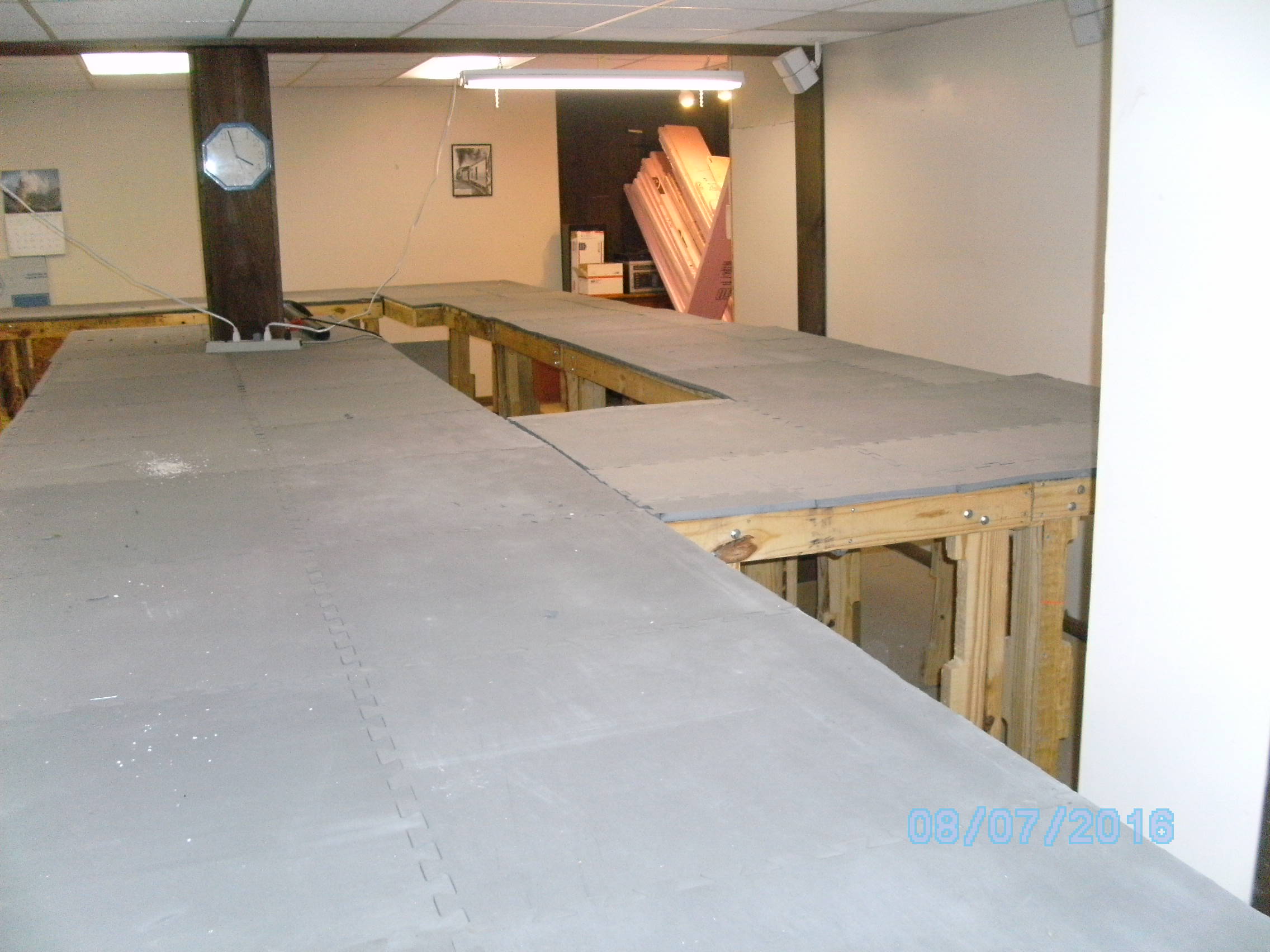 My name is Mike and my friend is Charlie. After multiple delays, like a flooded basement, broken bones and other delays we have finally come to the start of the planning stage. We first put down pink foam then replaced it with floor matting that we got for free. It is 1\2" by 2' by 2' interlocking pads. Below are some pics of it. The layout is 267 sq feet. One section we bought from a friend that had some scenery already built. This will need to reworked. Since we only get to work on it one day a week (If that) this will take a long time to complete. We hope to post our progress as we go.